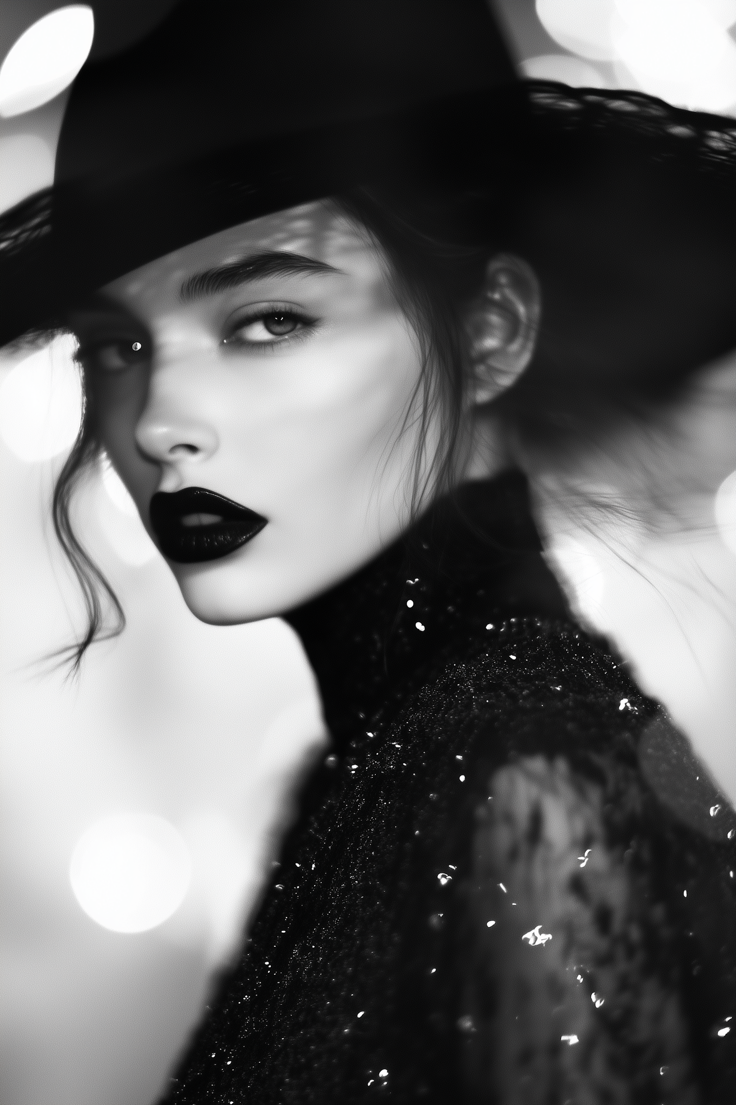 Elegant black-and-white portrait of a woman with dark lipstick, a wide-brimmed hat, and a shimmering outfit in a bokeh-lit setting.