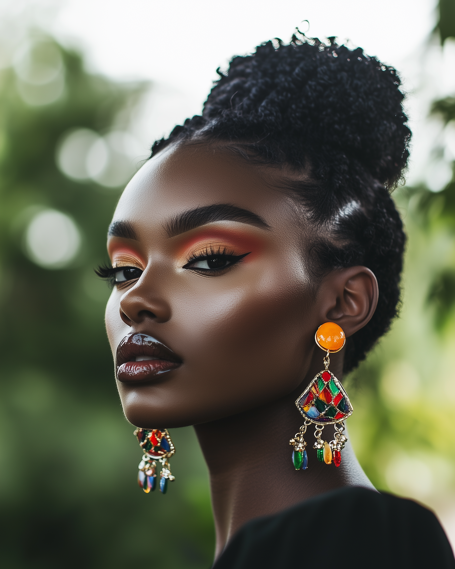Portrait of a Black woman with vibrant makeup and colorful earrings, set against a blurred green background.