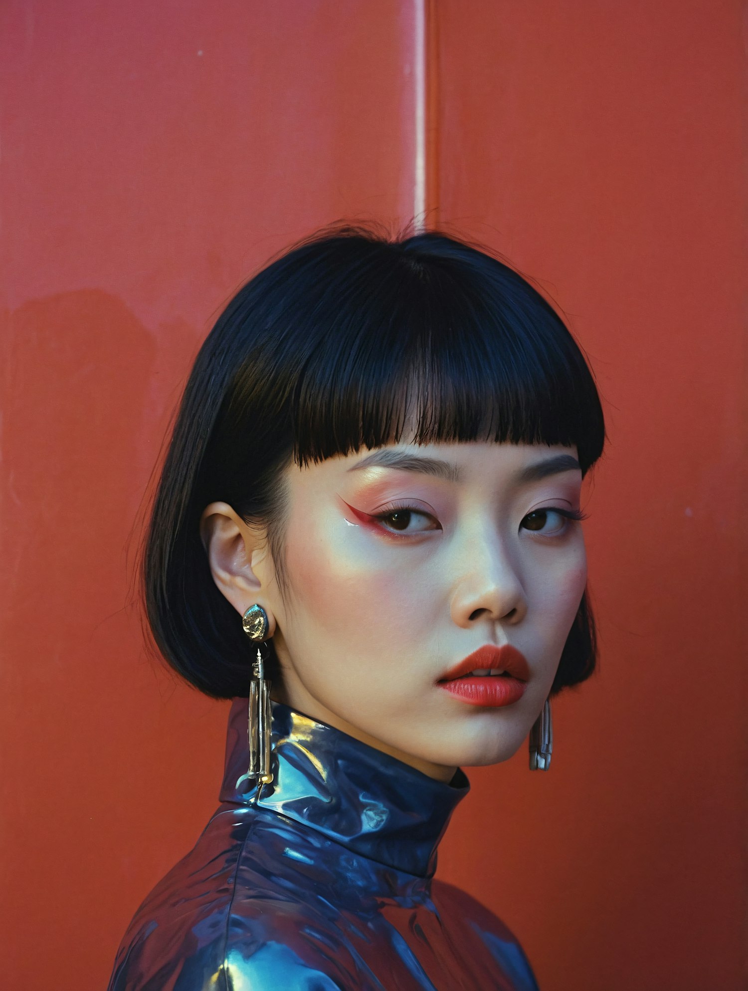Asian woman with sleek bob, red eyeliner, and metallic blue outfit against a red background. Striking and elegant fashion portrait.