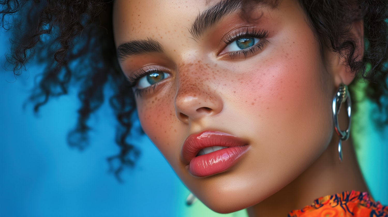 Close-up portrait of a young woman with freckles, blue-green eyes, and glossy pink lips, set against a vibrant blue background.