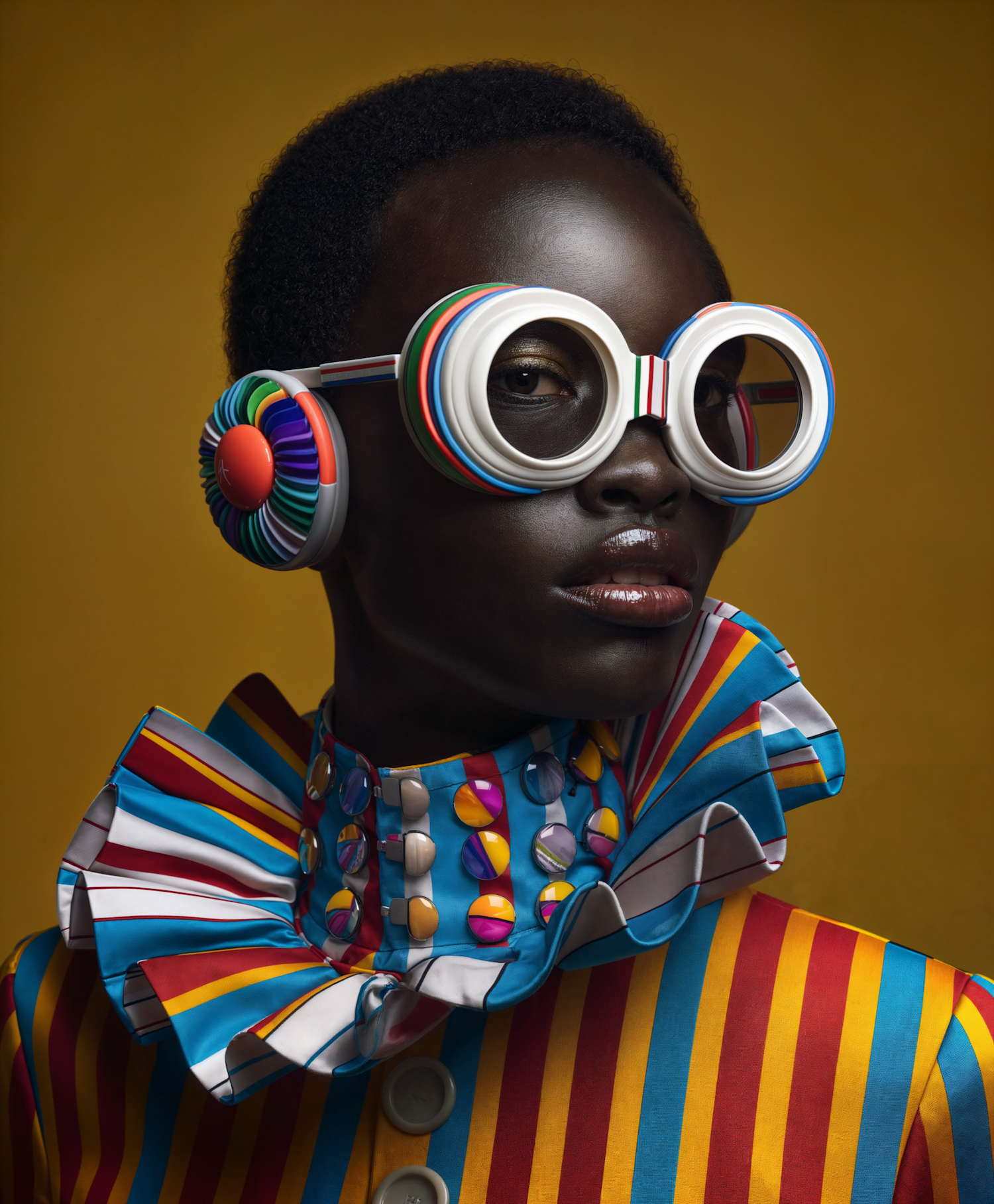 Futuristic fashion portrait with colorful glasses and headphones, vibrant striped outfit, and a warm mustard background.