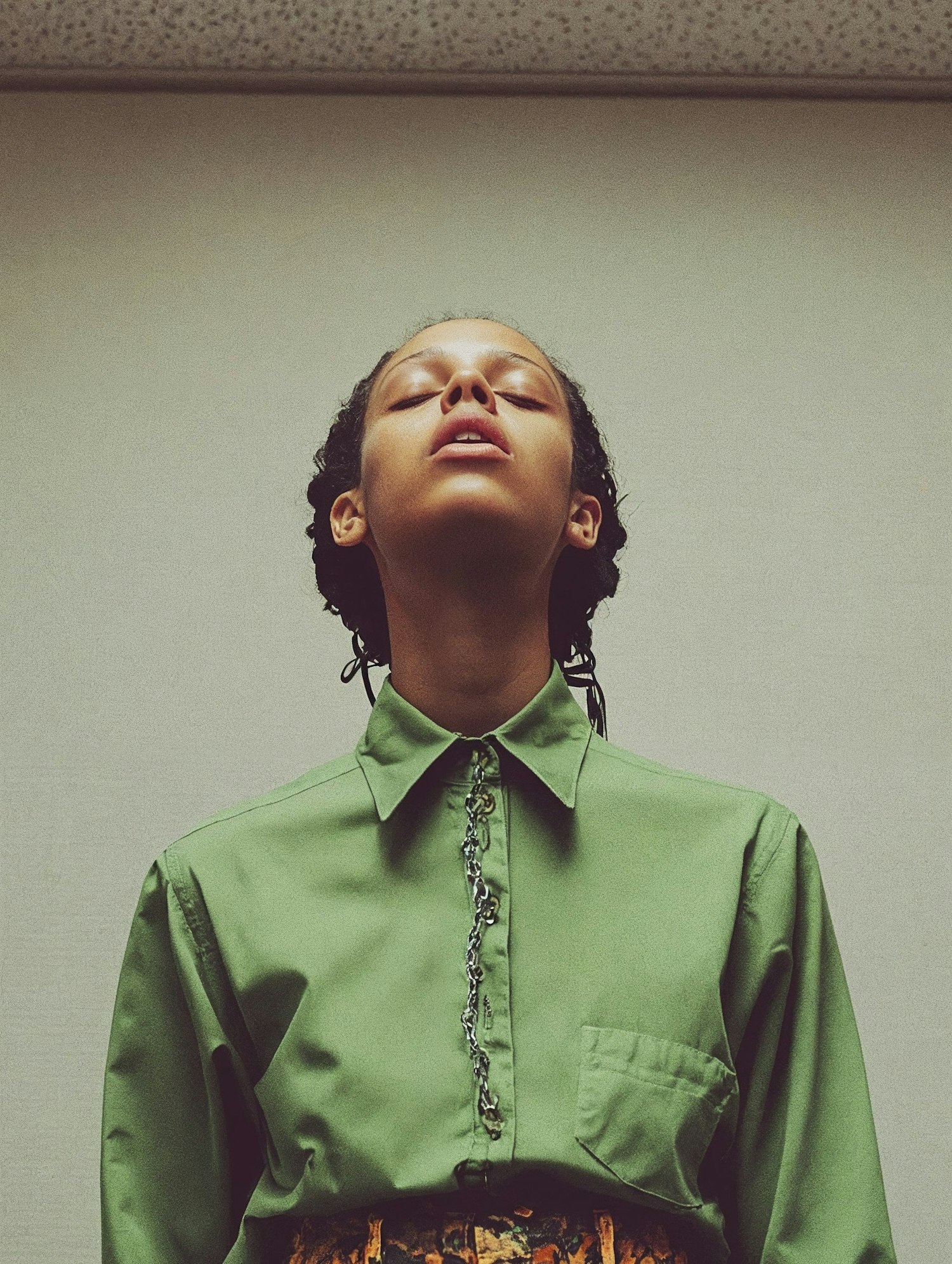 A young woman in a green shirt with chain details poses with her head tilted back, eyes closed, against a neutral background.