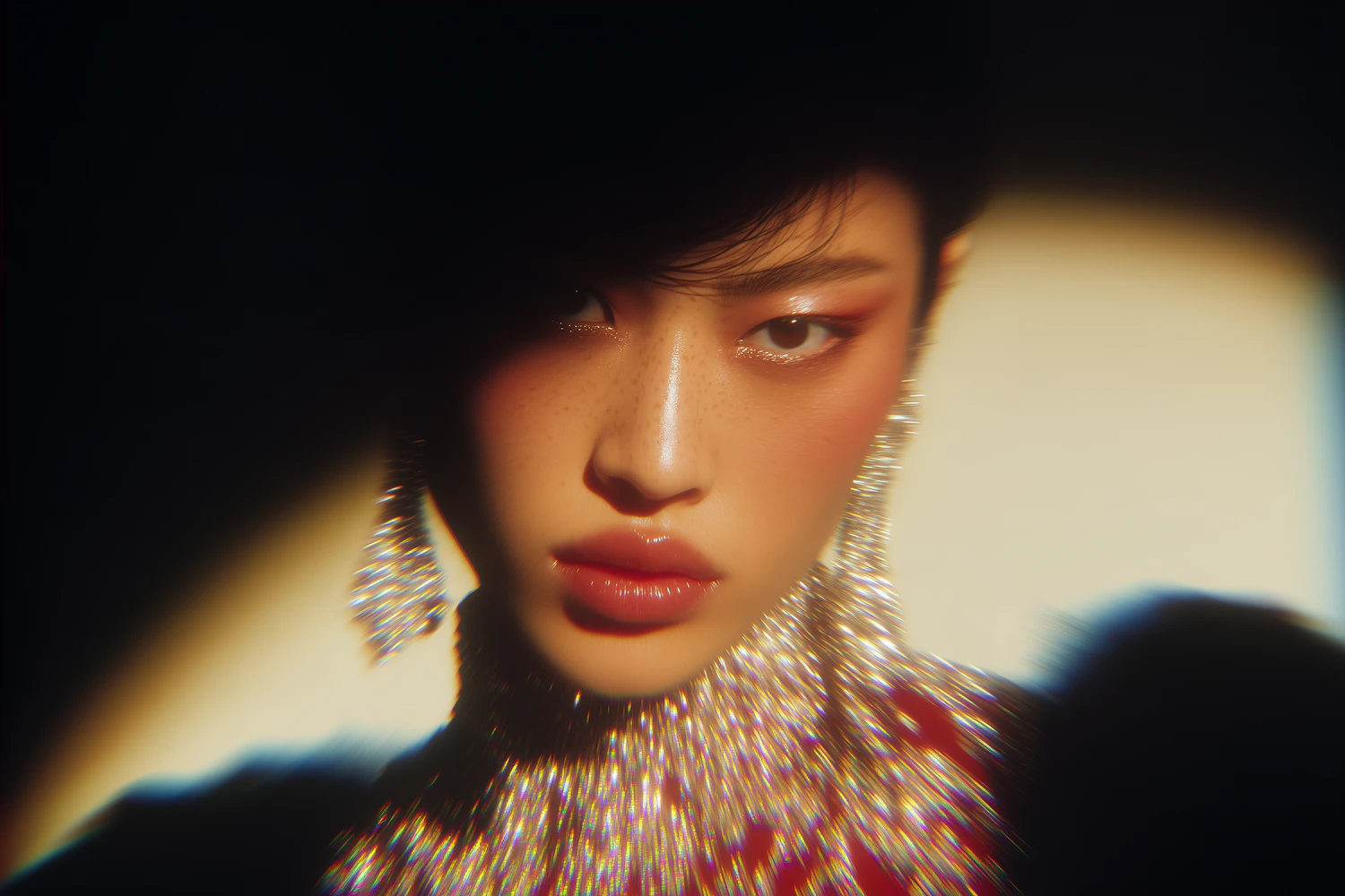 Close-up portrait of a person with bold makeup, sparkling earrings, and dramatic lighting, creating an intense and striking visual.