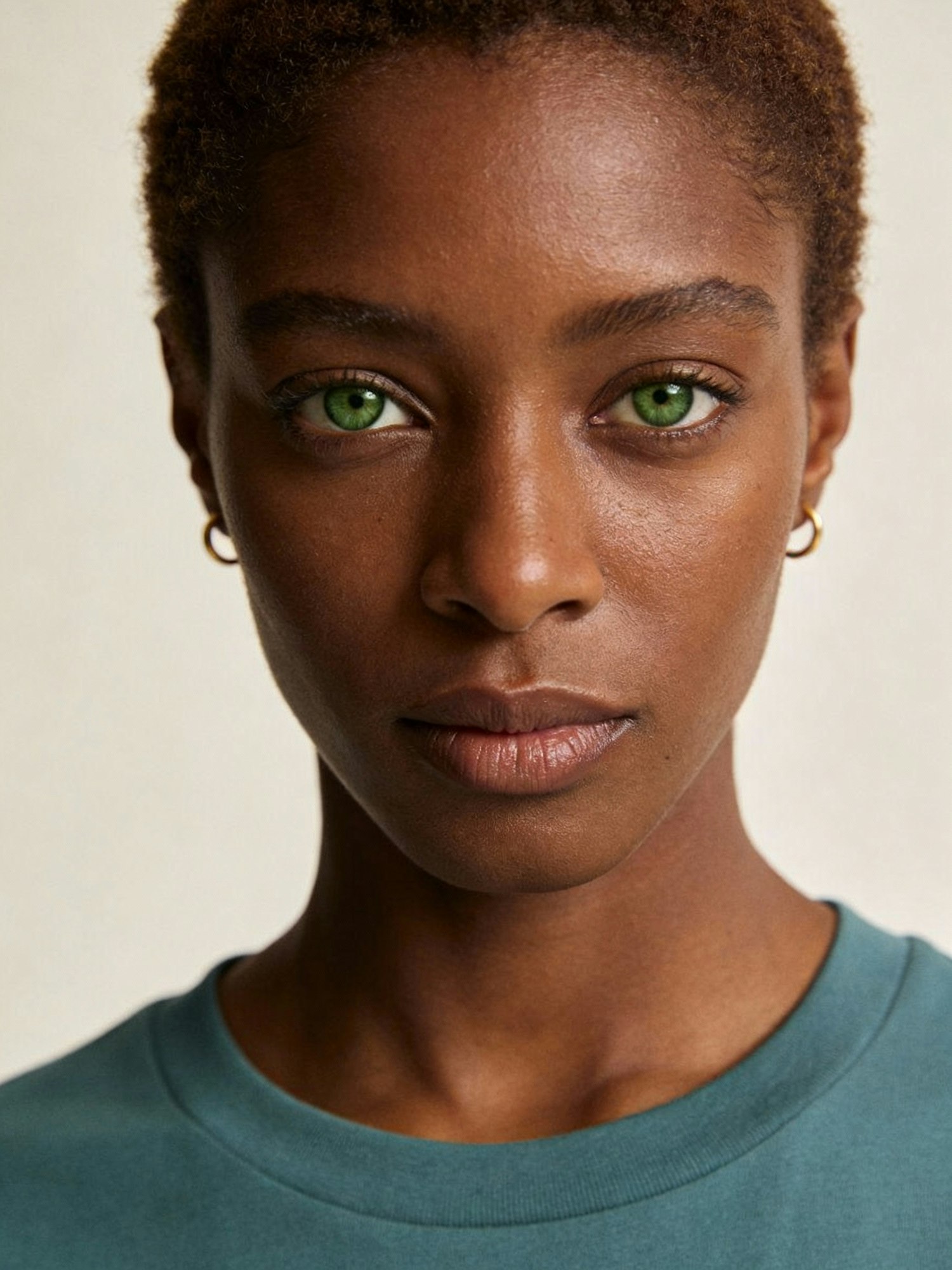 close-up portrait of a person with short brown hair, green eyes, and gold earrings, wearing a green shirt in warm lighting. rich brown skin and short, natural hair gazes directly into the camera with a calm, grounded expression. She wears a teal crew neck shirt—simple, soft, and modern—paired with a small hoop earring in her left ear. The background is plain and light-toned, creating a clean visual field that draws focus to her face and silhouette. Lighting is soft and even, highlighting skin texture, the gentle curve of the neckline, and the subtle metallic glint of the earring. The mood is introspective and quietly confident, blending minimalism with emotional resonance. Hyperrealistic rendering should emphasize skin detail, fabric texture, and tonal harmony across wardrobe, background, and complexion.