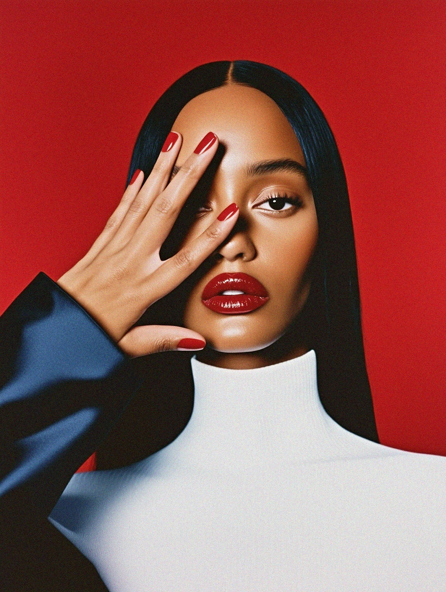 Bold portrait of a woman with glossy red lips, sleek black hair, and red nails against a vibrant red background. Striking and artistic.