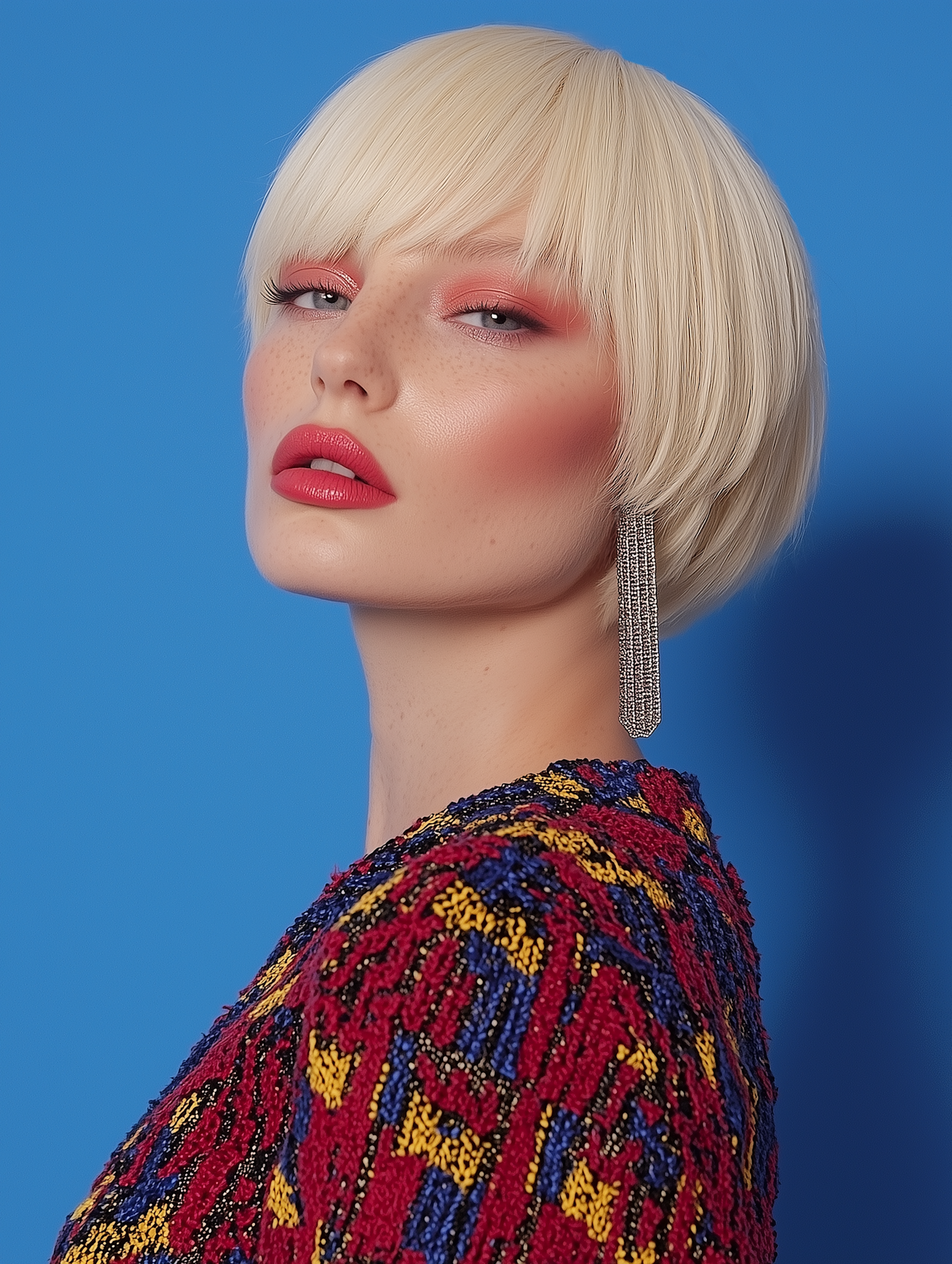Stylish woman with platinum blonde bob, bold makeup, and colorful attire against a blue background.