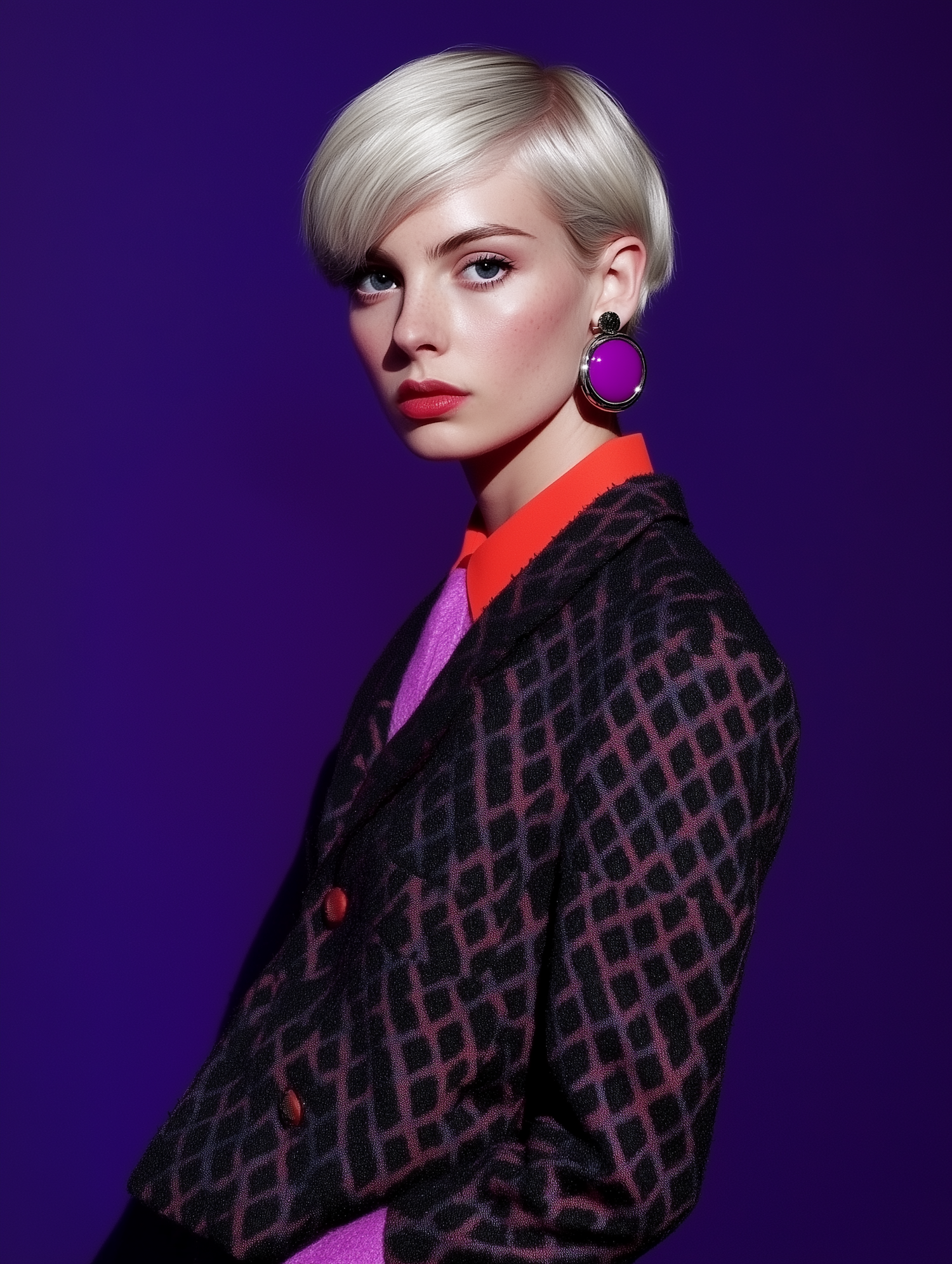 Stylish woman with platinum blonde hair, bold makeup, and vibrant outfit against a deep purple background.