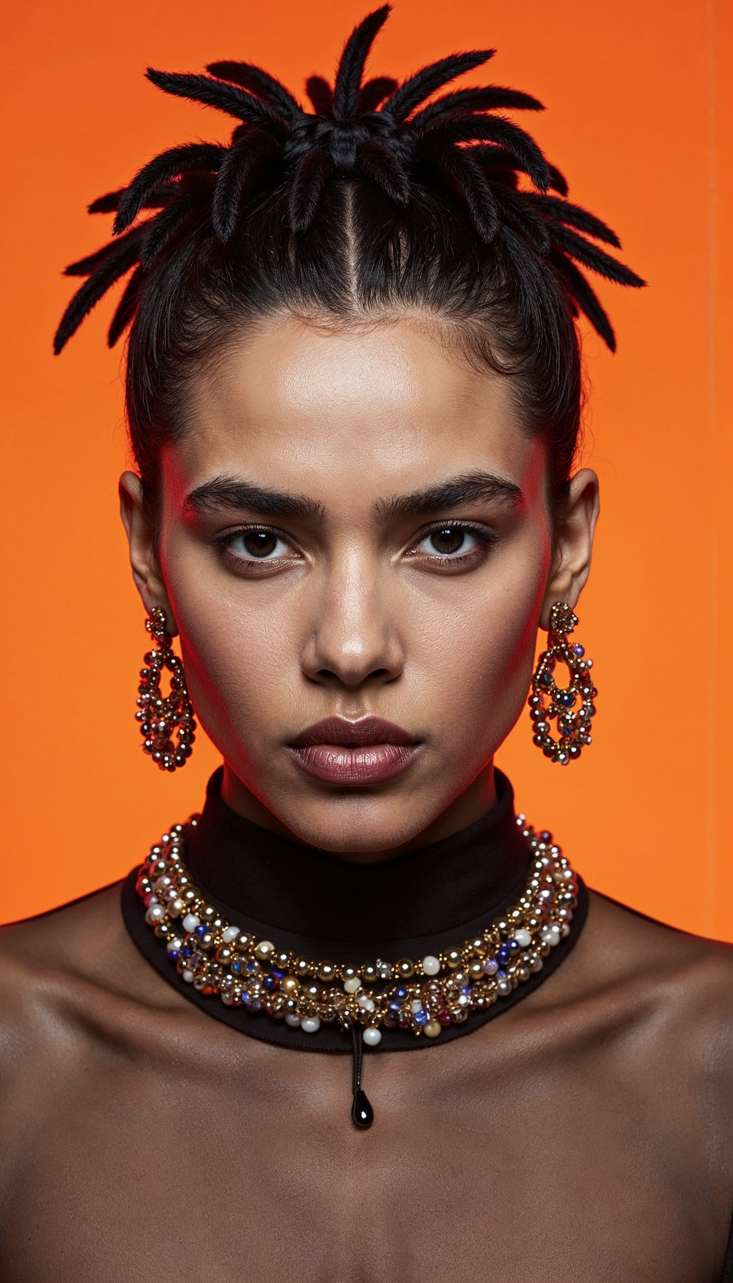 A woman with braided hair and ornate jewelry poses against a vibrant orange background, exuding elegance and intensity.