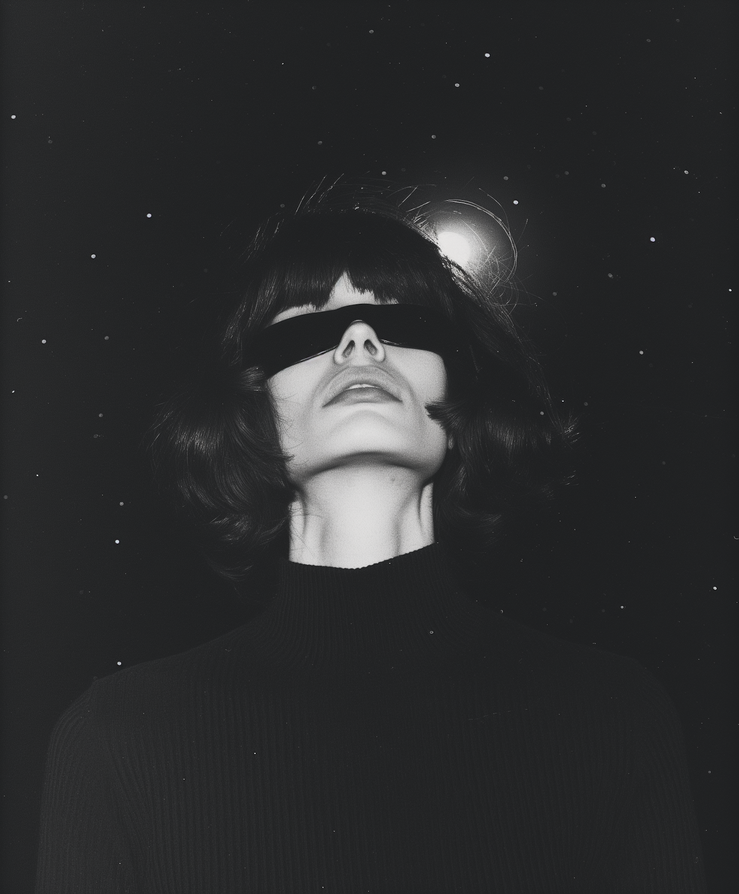Mysterious black and white portrait with futuristic sunglasses and starry background, creating an enigmatic and otherworldly vibe.