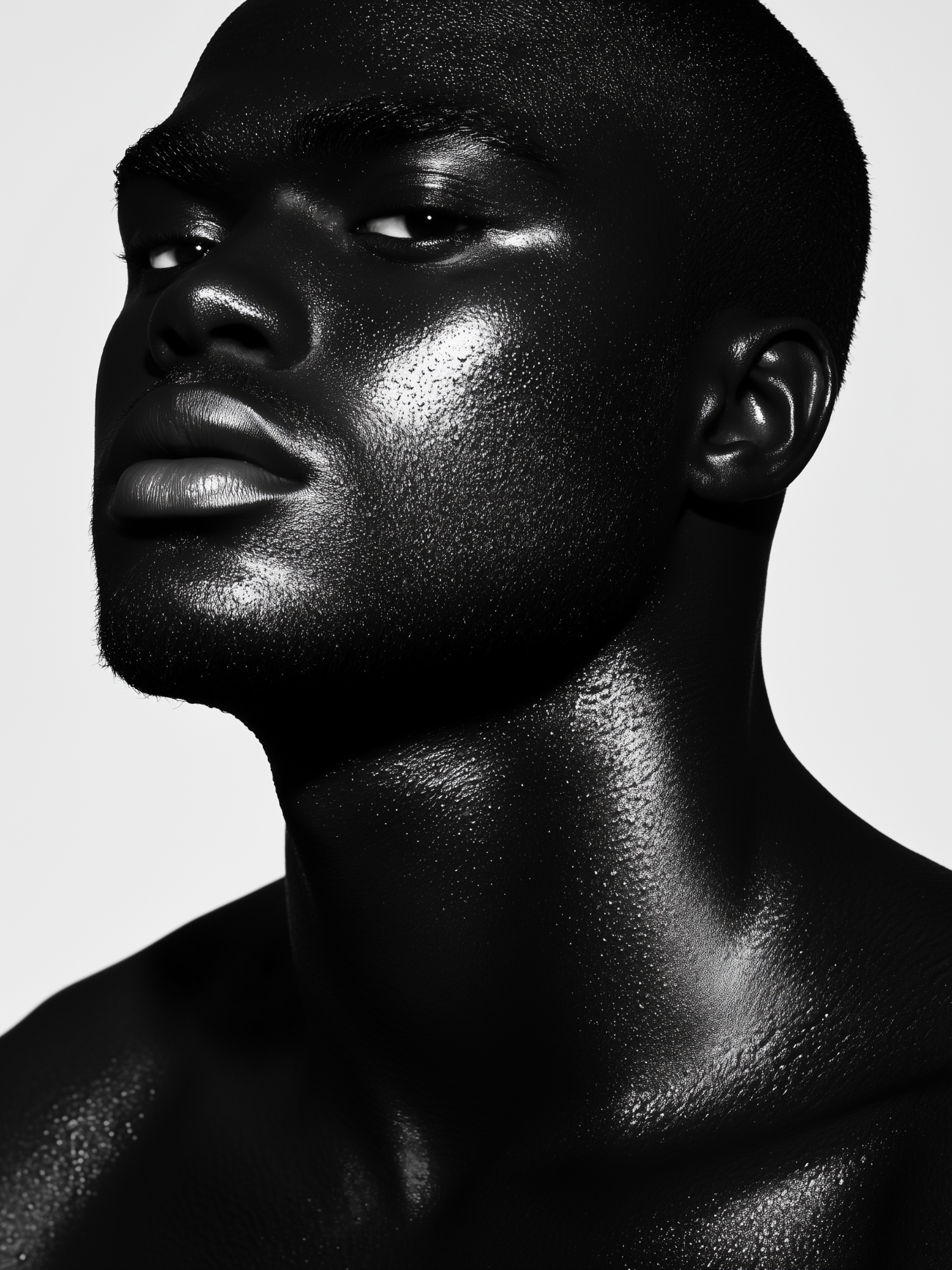 Striking close-up portrait of a Black man with glossy skin, highlighting facial contours and a serious expression.