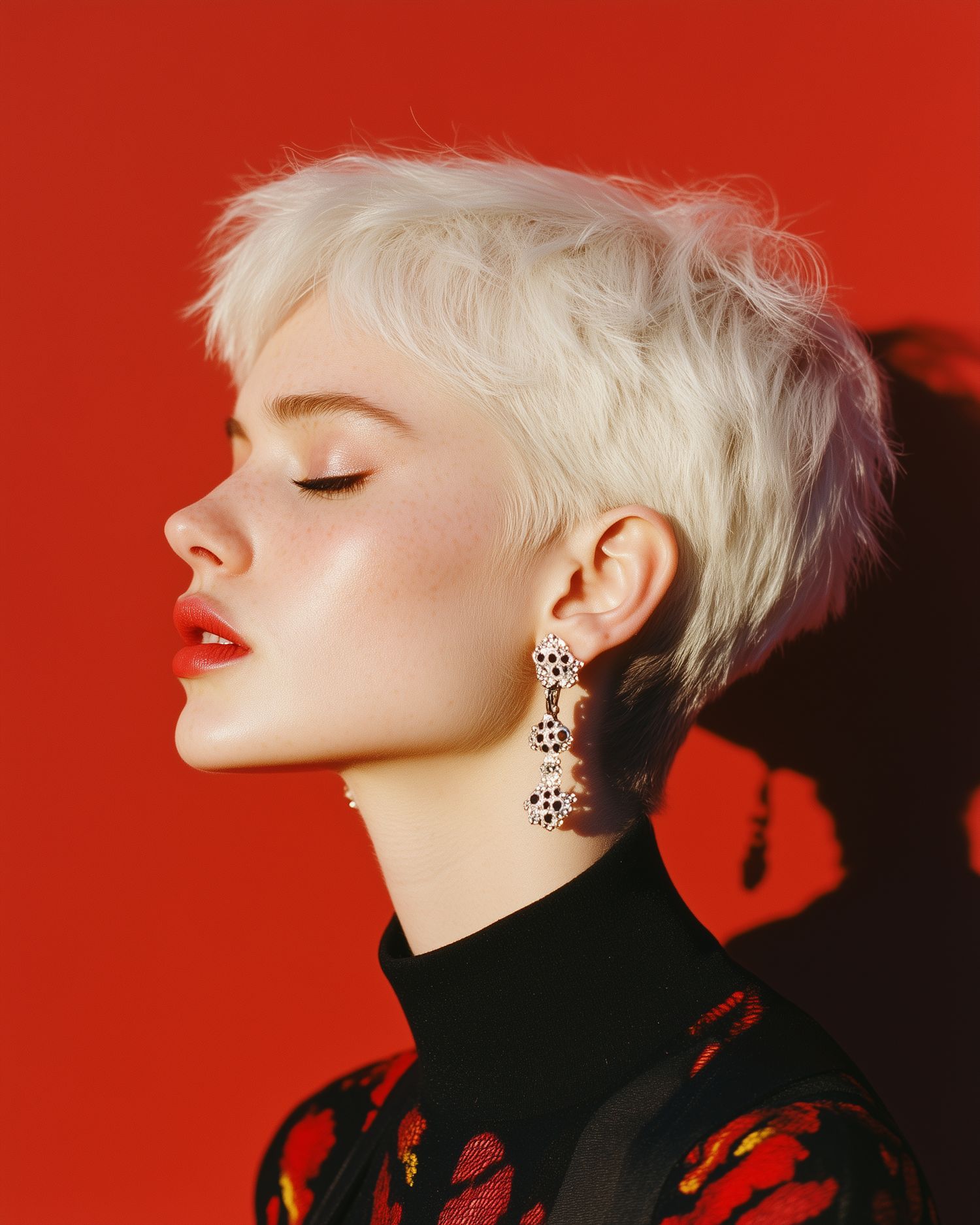 Profile of a woman with platinum blonde hair and bold earrings against a red background, wearing a black floral top.