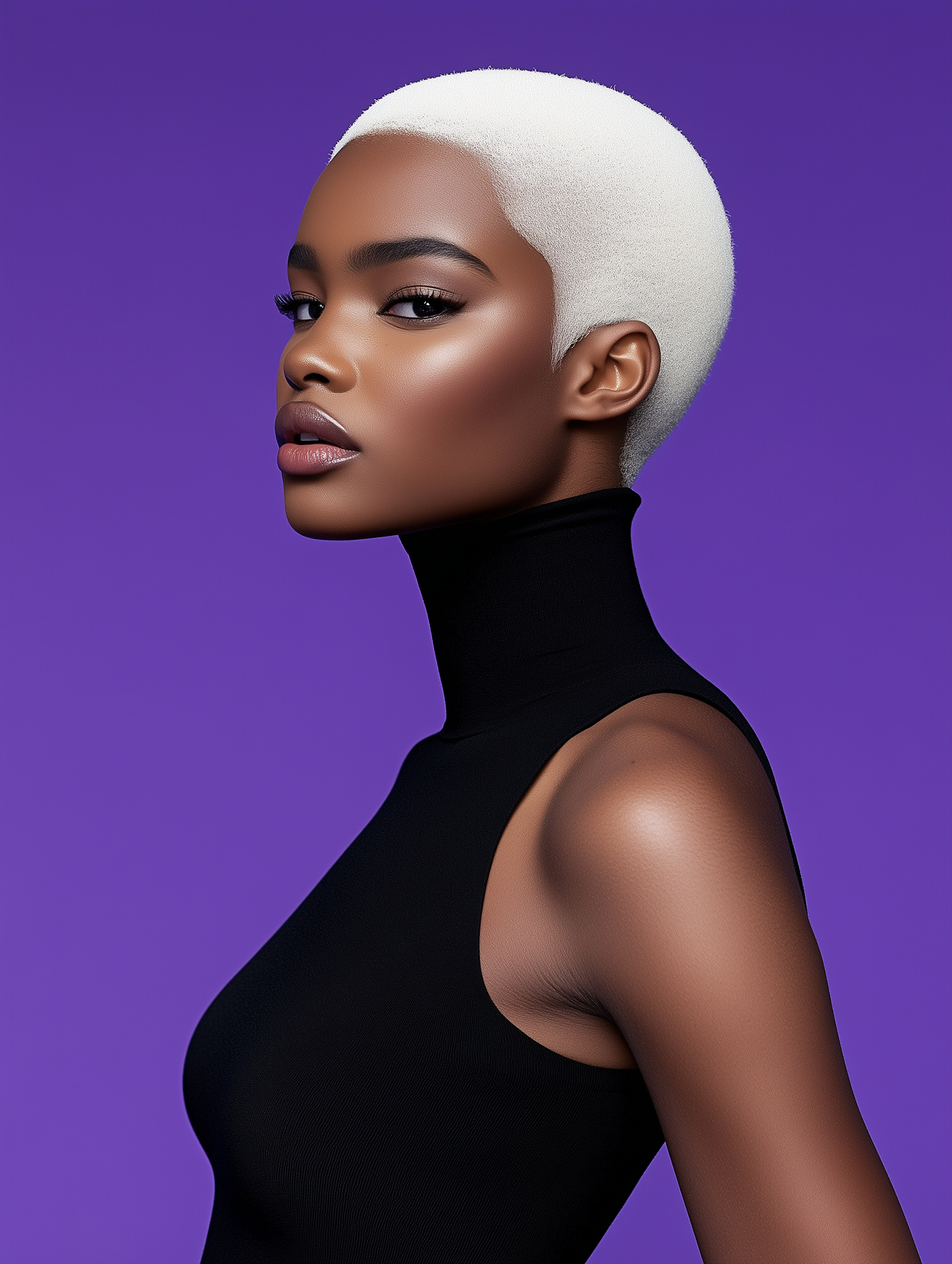Elegant portrait of a woman with platinum blonde hair against a vibrant purple background, wearing a black turtleneck.