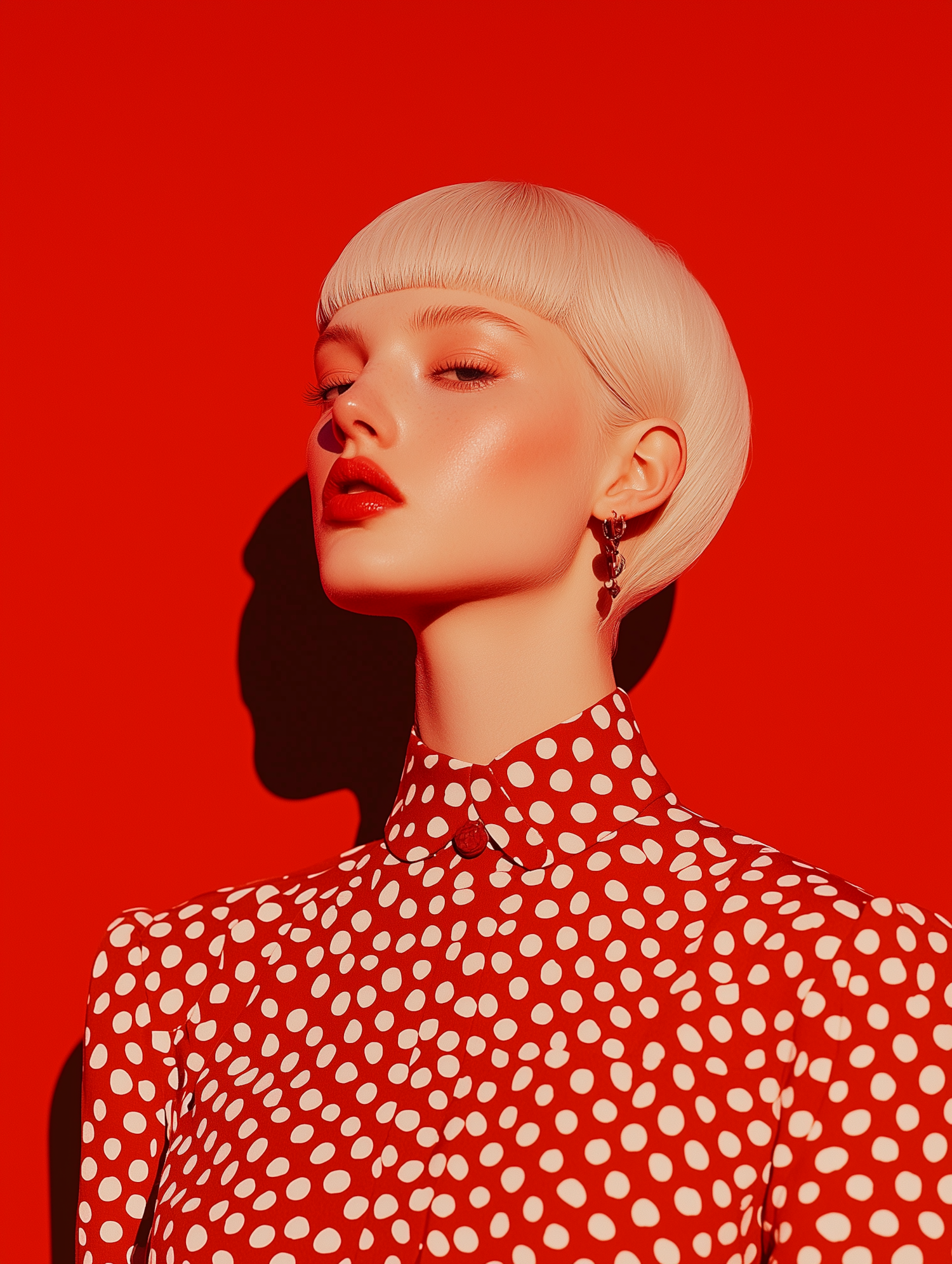 Caucasian woman with platinum blonde bob, red polka dot blouse, and bold red lipstick against a vibrant red background.