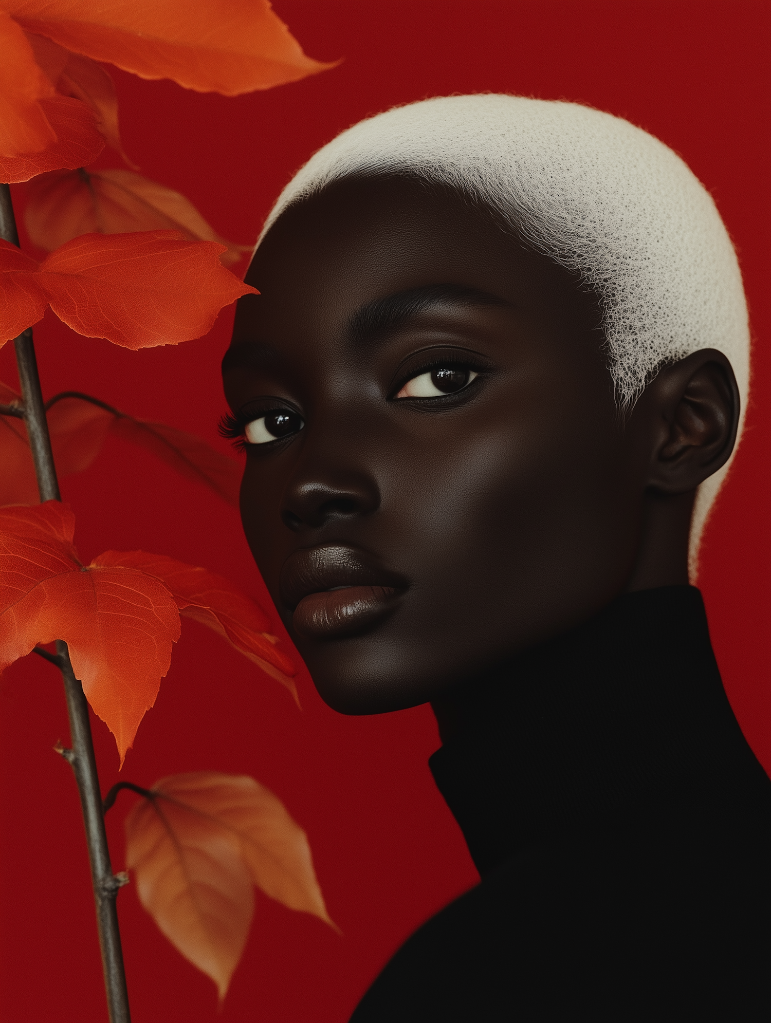 Striking portrait of a Black woman with white hair against a red background, featuring vibrant orange leaves. Bold and artistic composition.