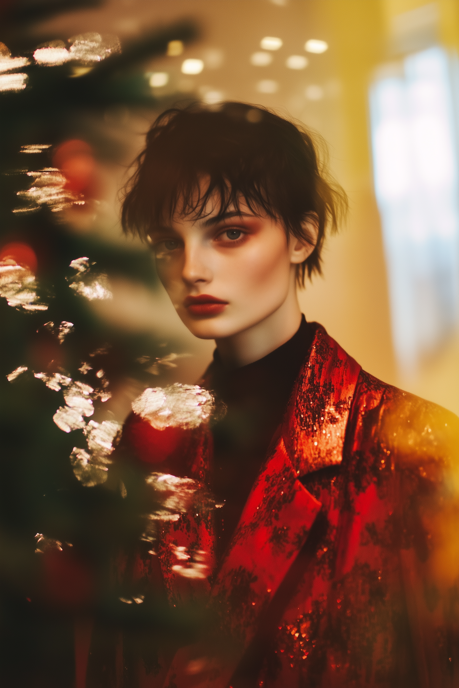 Stylish person in a red sequined jacket with a festive Christmas tree, creating a cozy and elegant holiday atmosphere.
