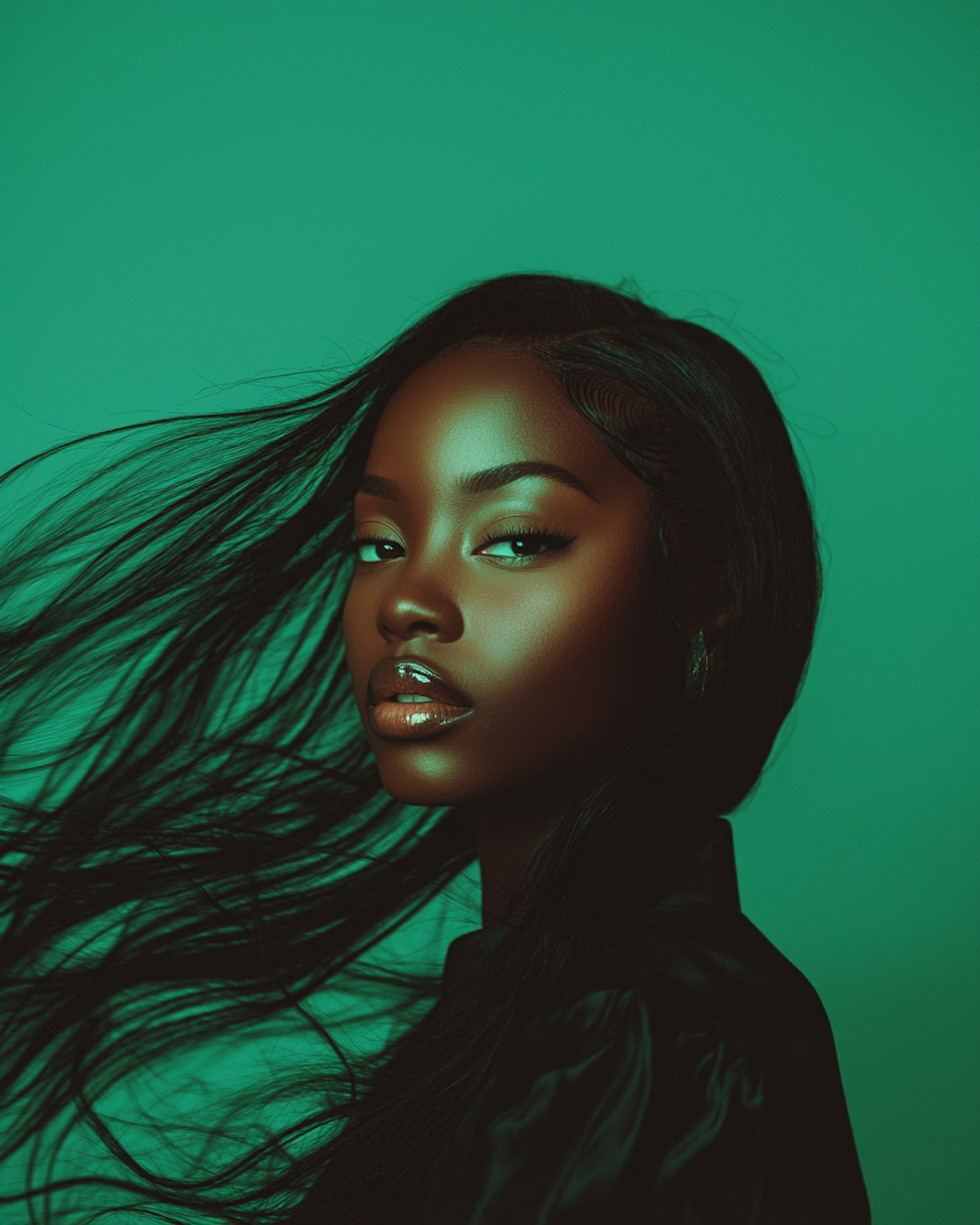 Bold portrait of a Black woman with flowing hair, glowing skin, and glossy lips against a vibrant green background.