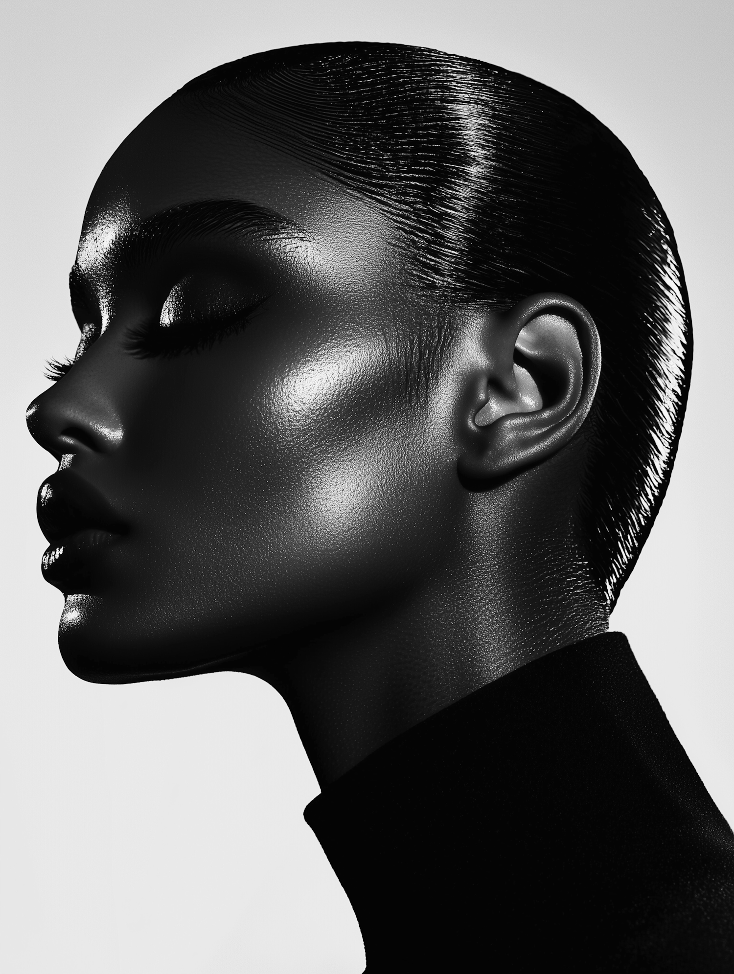 Elegant black and white profile portrait with sleek hair and radiant skin, highlighting facial contours and artistic lighting.