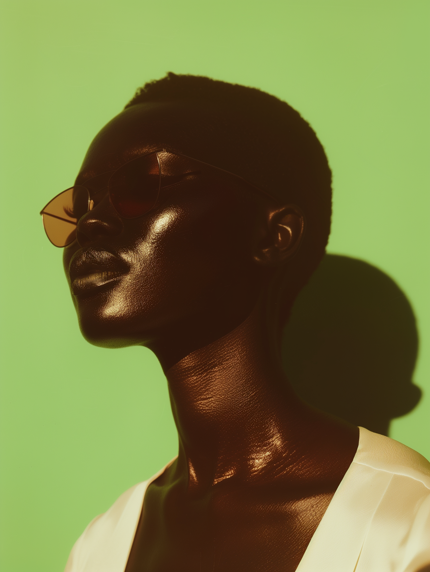 Portrait of a Black woman with sunglasses against a vibrant green background, showcasing glossy skin and a serene expression.