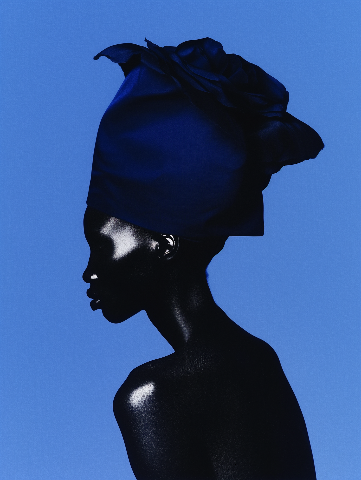 Elegant profile of a woman with a dark blue headwrap against a vibrant blue background, highlighting grace and style.