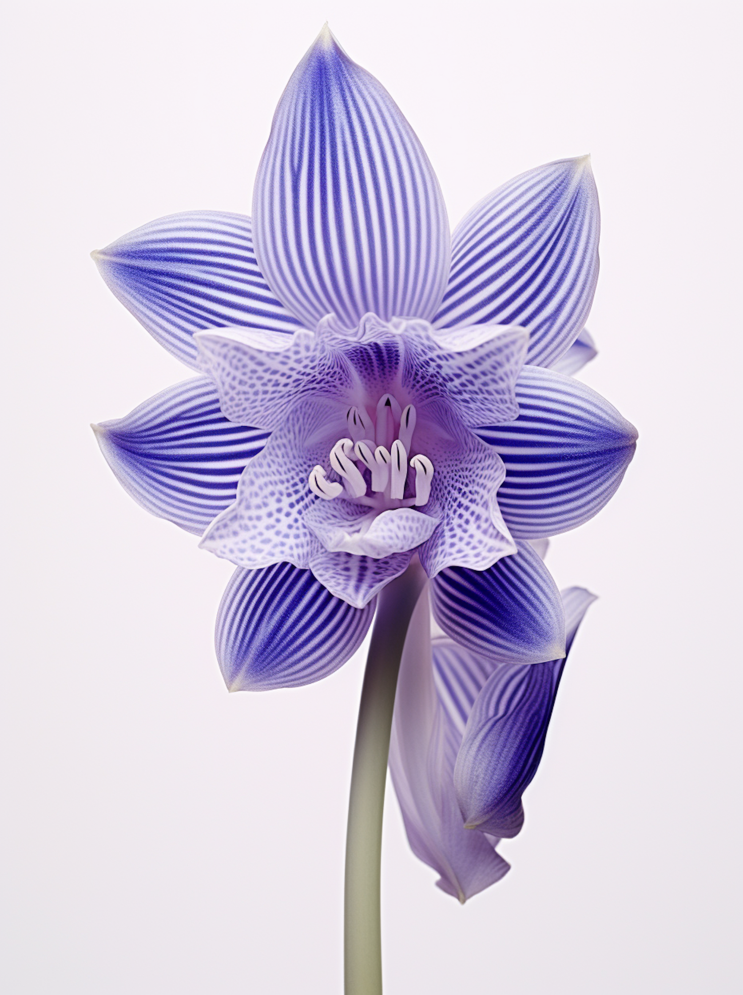 Close-up of a vibrant purple flower with striped petals and speckled center, set against a clean white background.