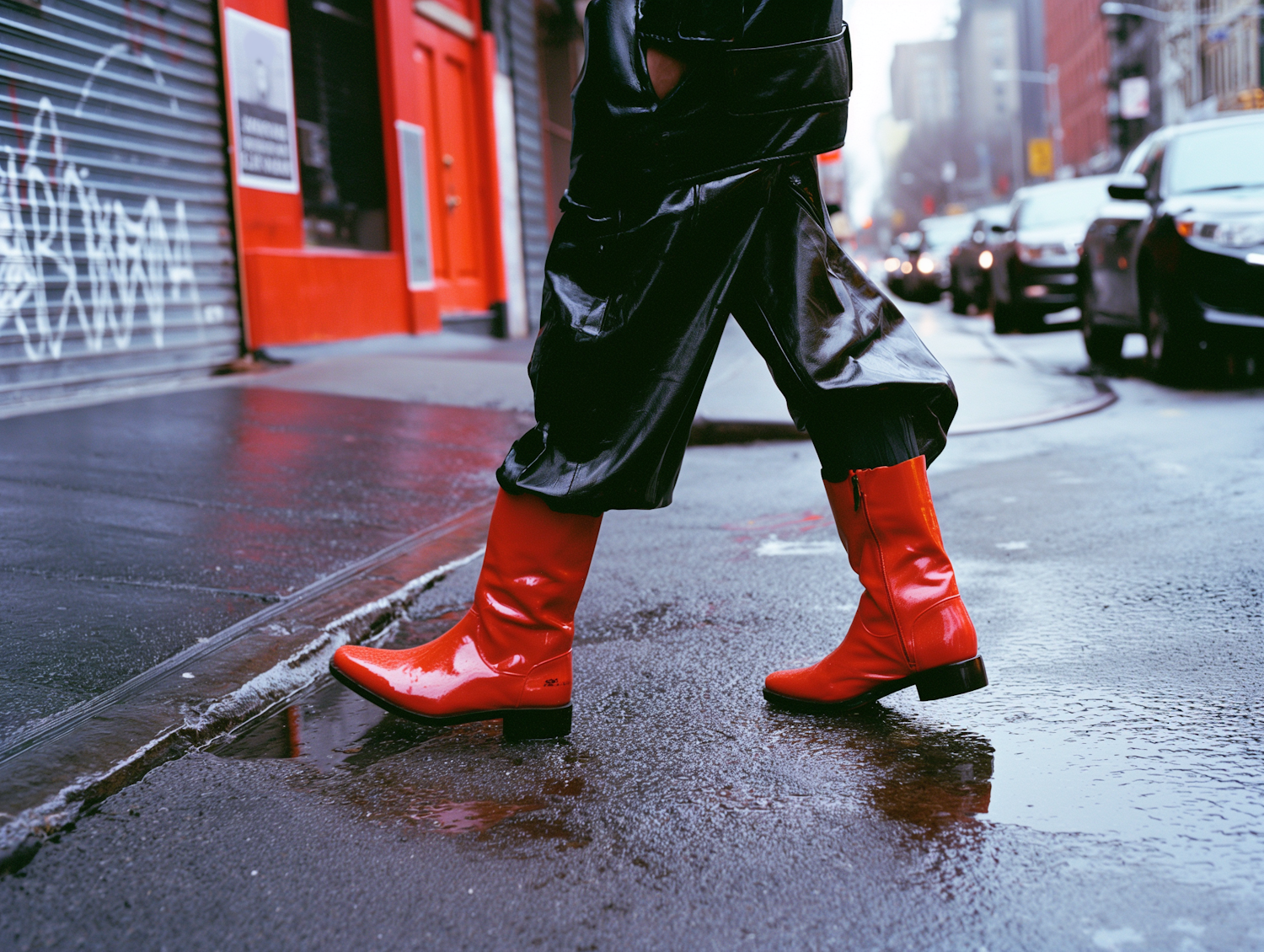 Stylish red boots stride across a wet city street, reflecting urban fashion against a backdrop of rain-soaked pavement and buildings.