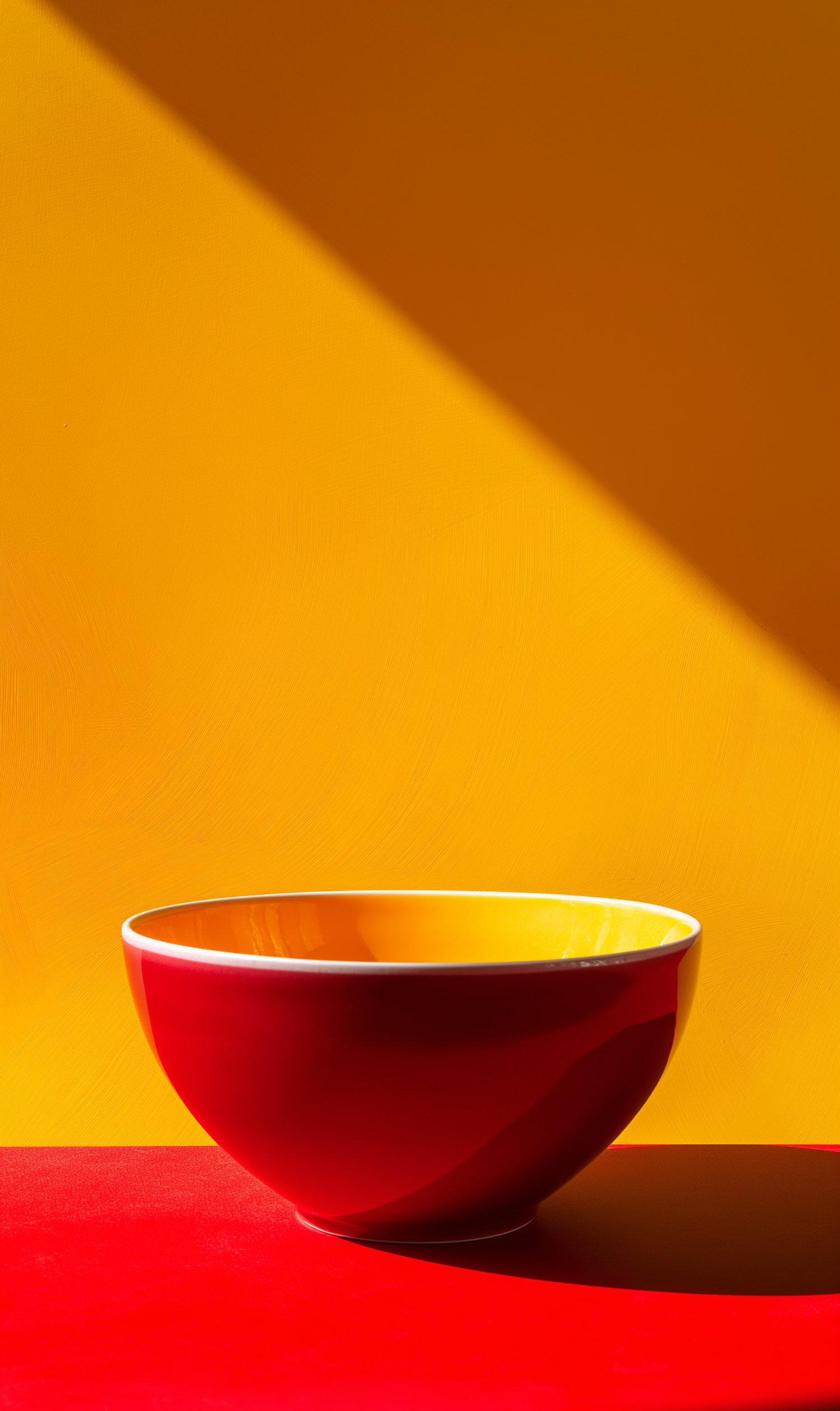 Vibrant red bowl on a red surface against a yellow background with sharp lighting and shadows, creating a bold, minimalistic composition.