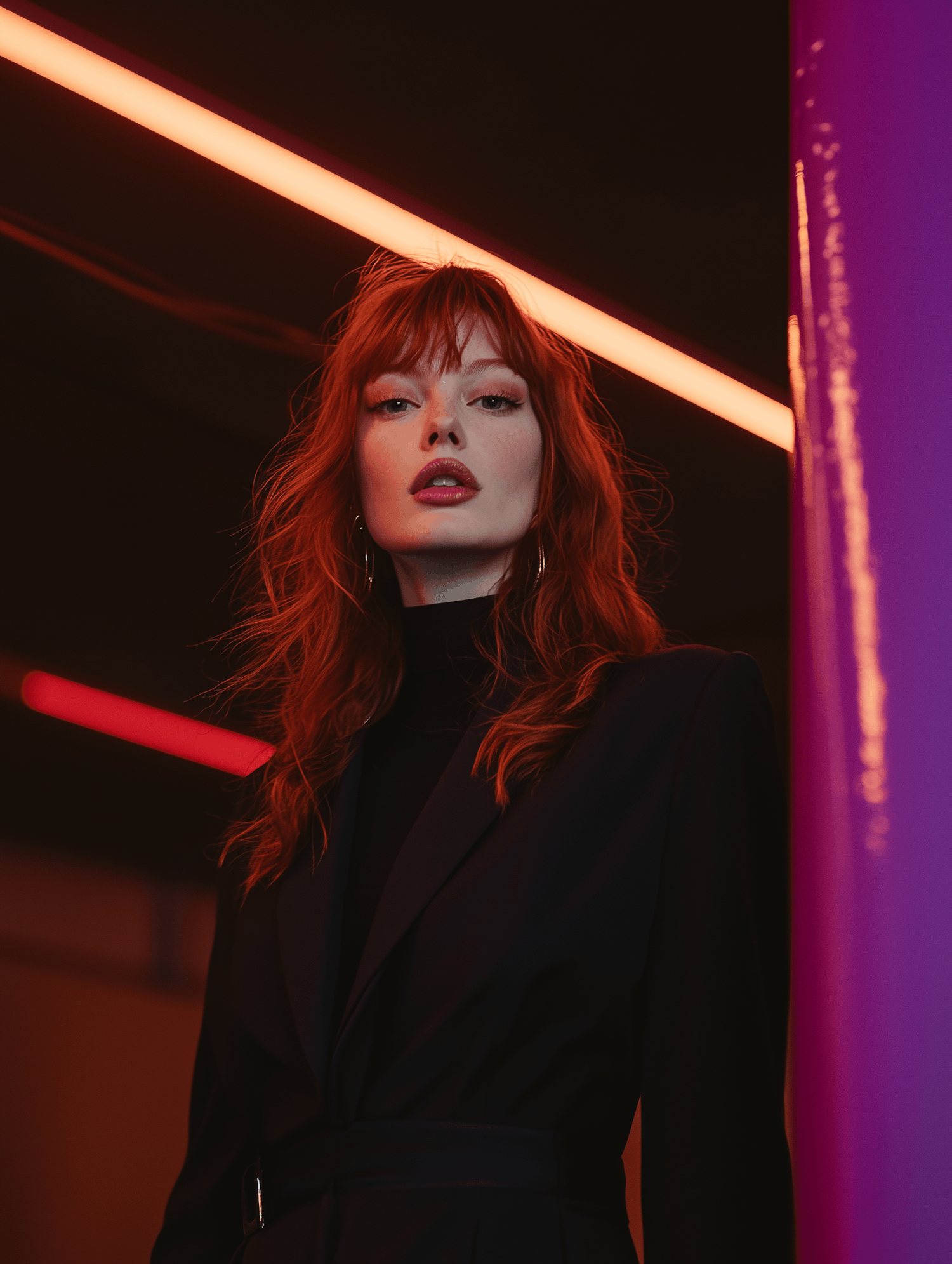 Striking red-haired woman in black attire with neon red and purple lights, exuding confidence and modern elegance.