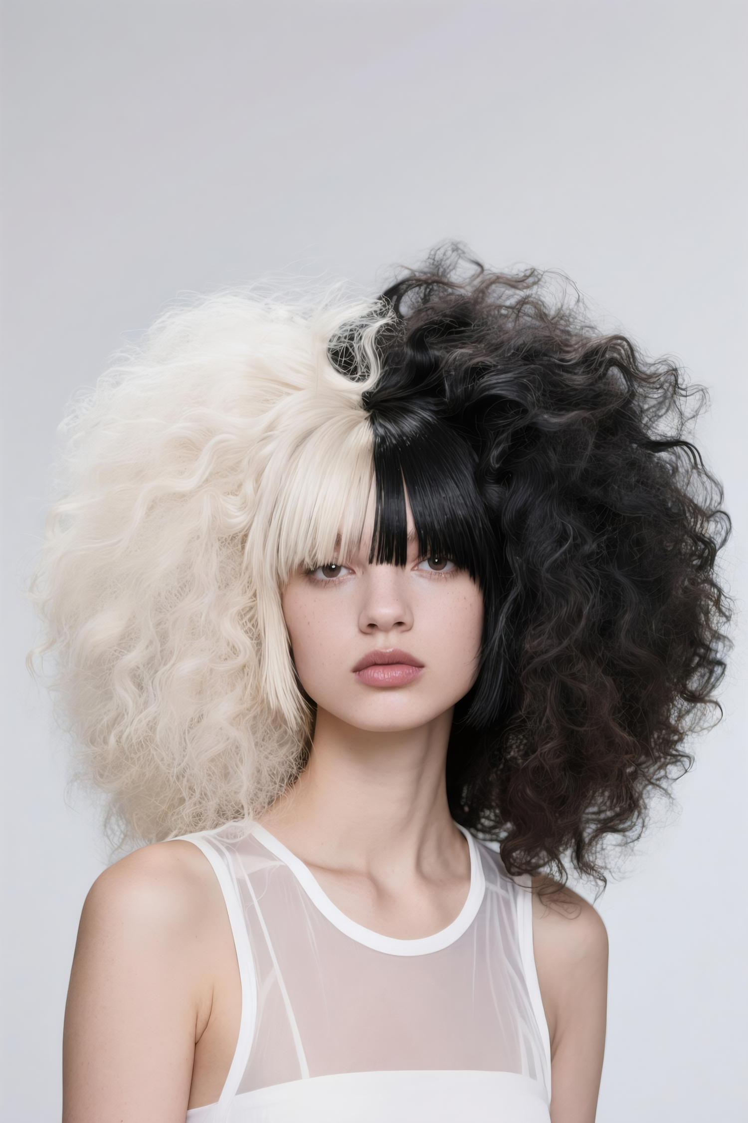 A striking portrait of a woman with a bold black-and-white split hairstyle, voluminous curls, and a sheer white top against a neutral background.