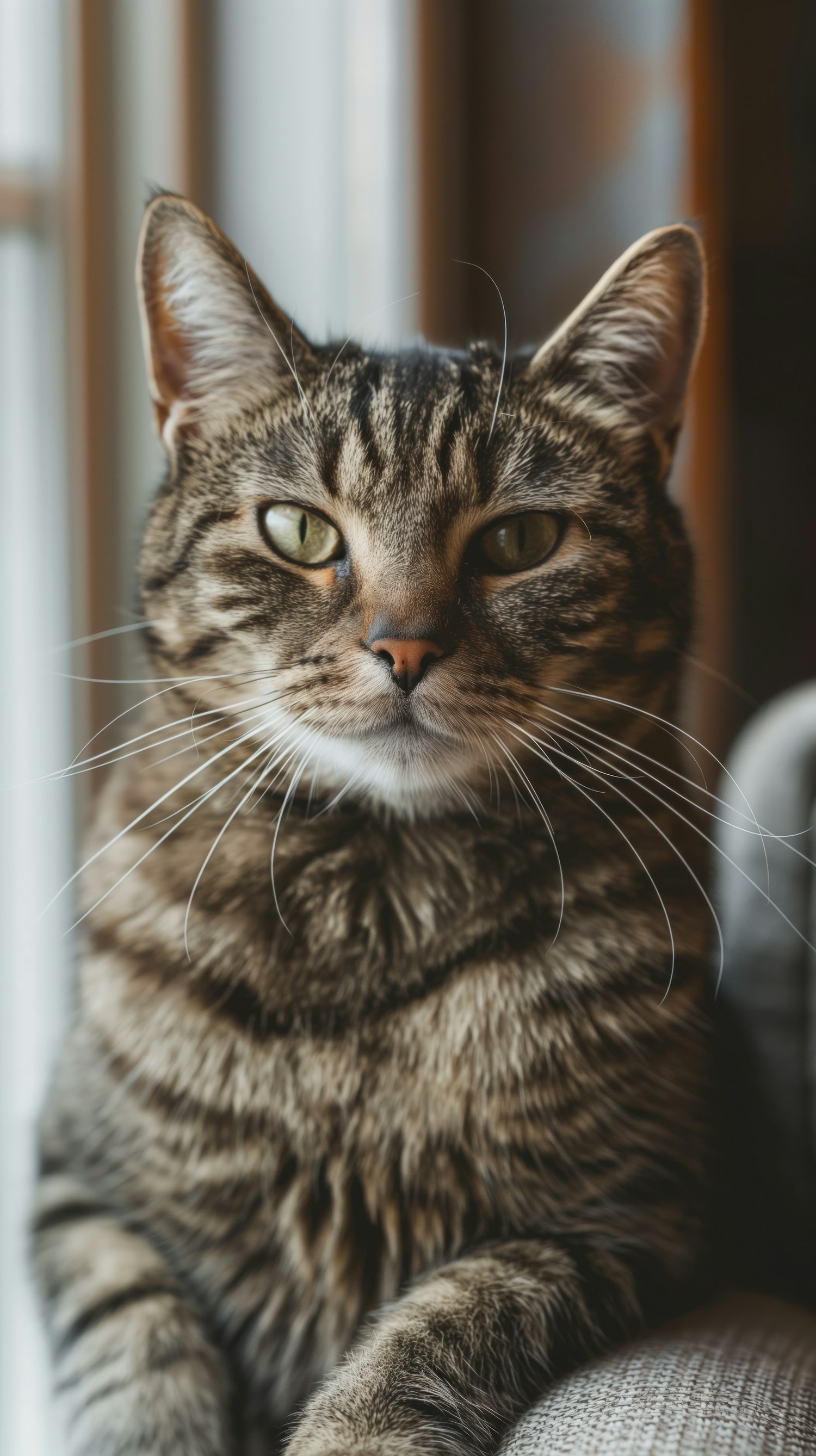 Close-up of a tabby cat with green eyes and striped fur, sitting indoors by a window.