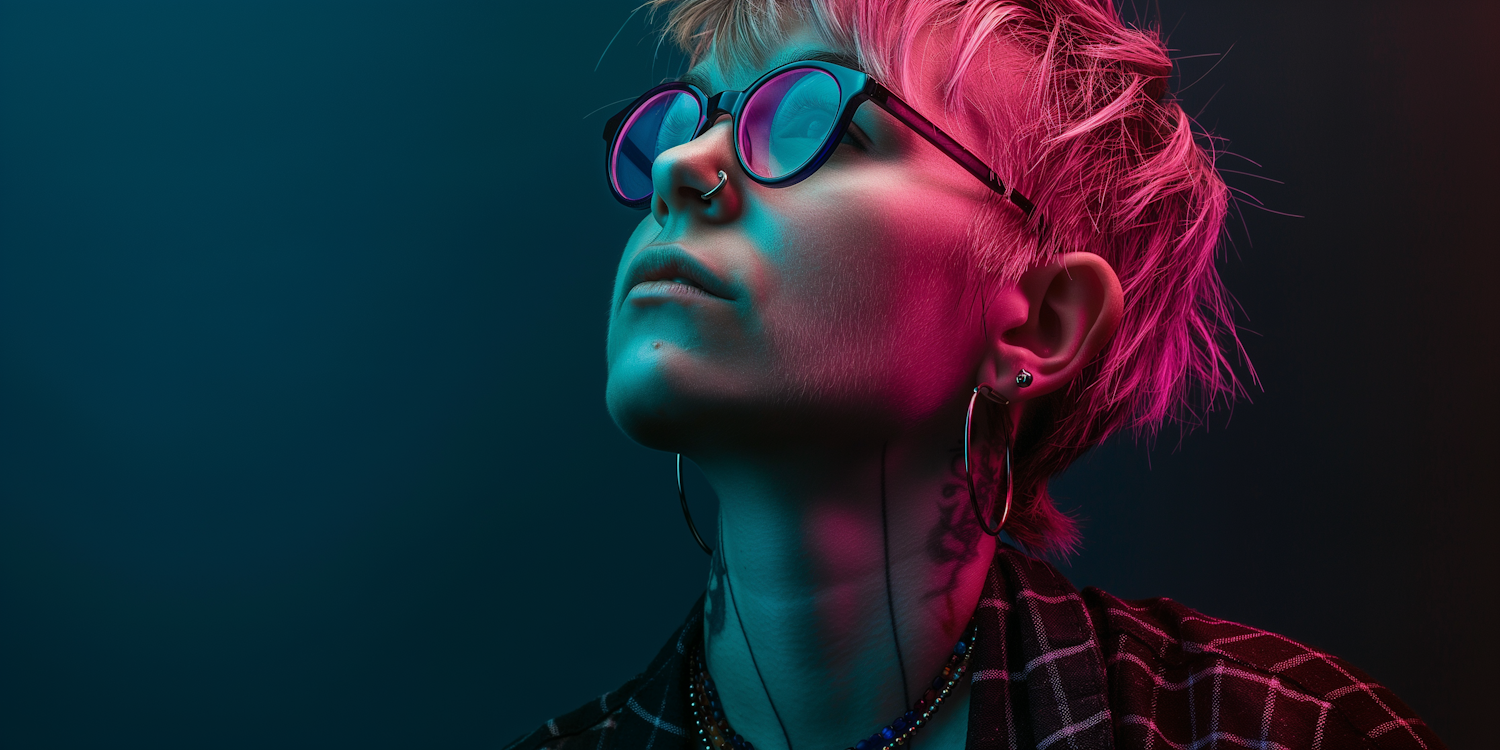 Stylish portrait of a person with pink hair, sunglasses, and piercings, set against a dramatic blue and pink light.