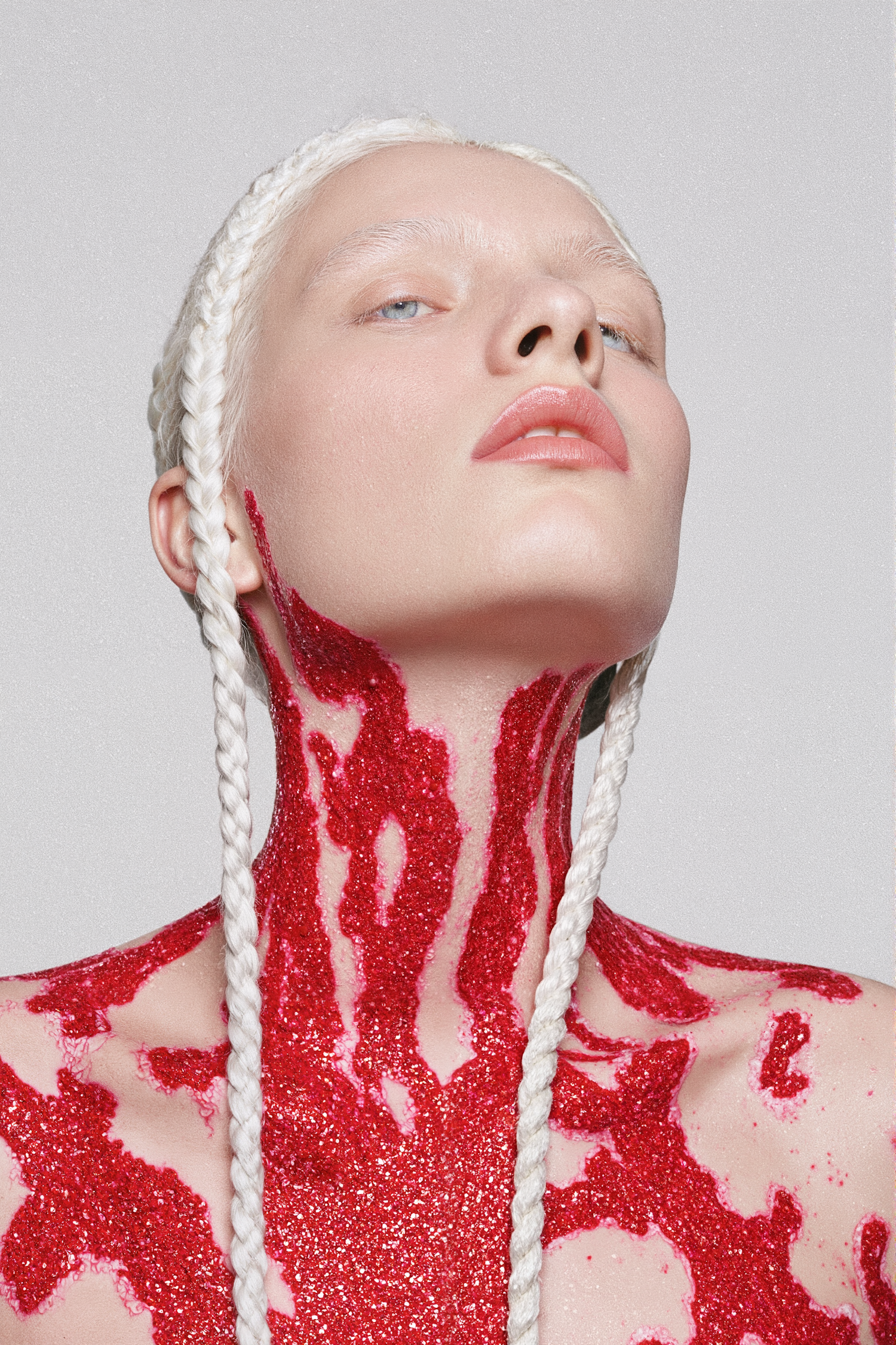 Artistic portrait with platinum blonde braids and red glitter on skin, creating a striking contrast against a light gray background.