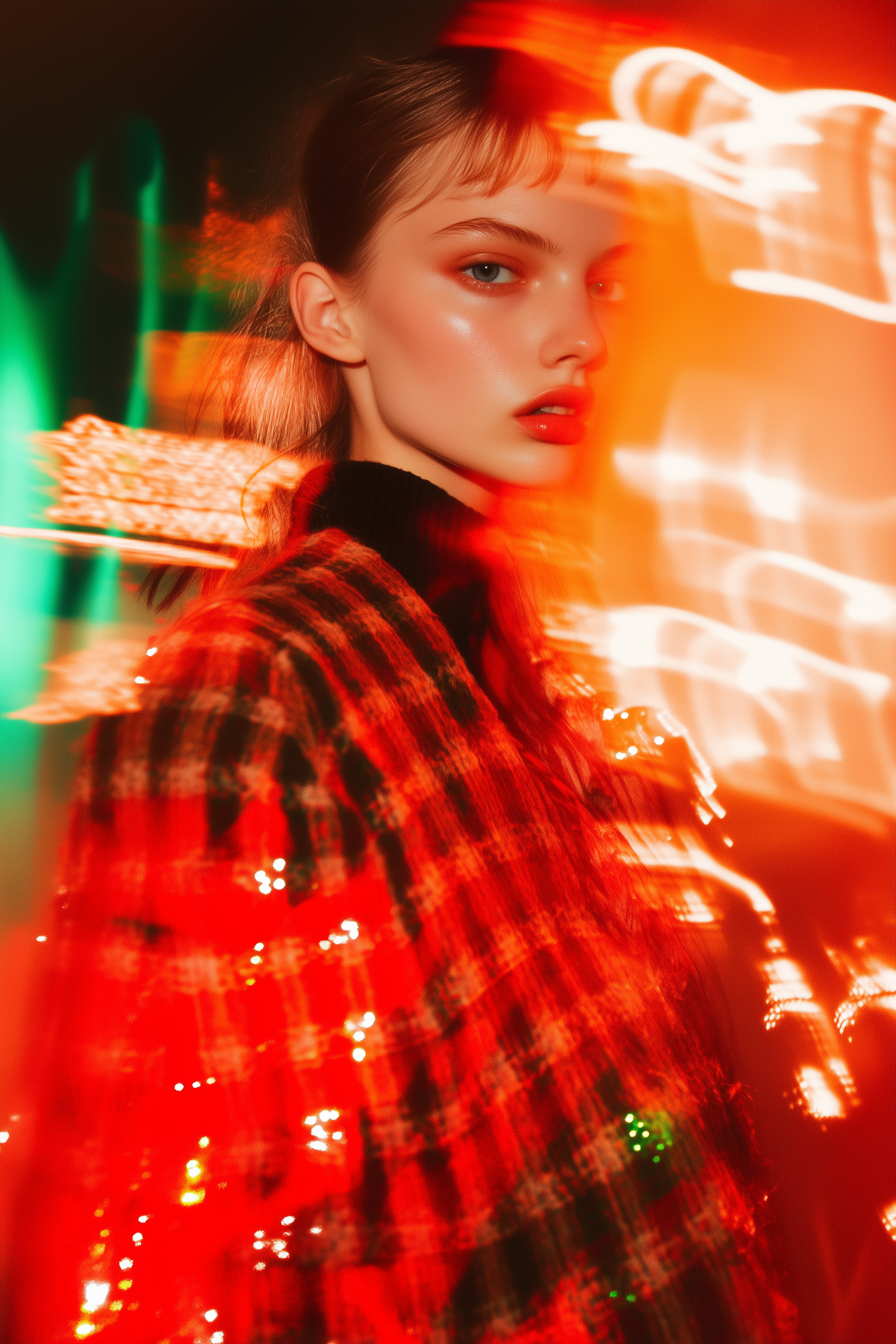 A young woman in a shimmering plaid jacket with vibrant red and orange lighting, creating a dynamic and intense visual effect.