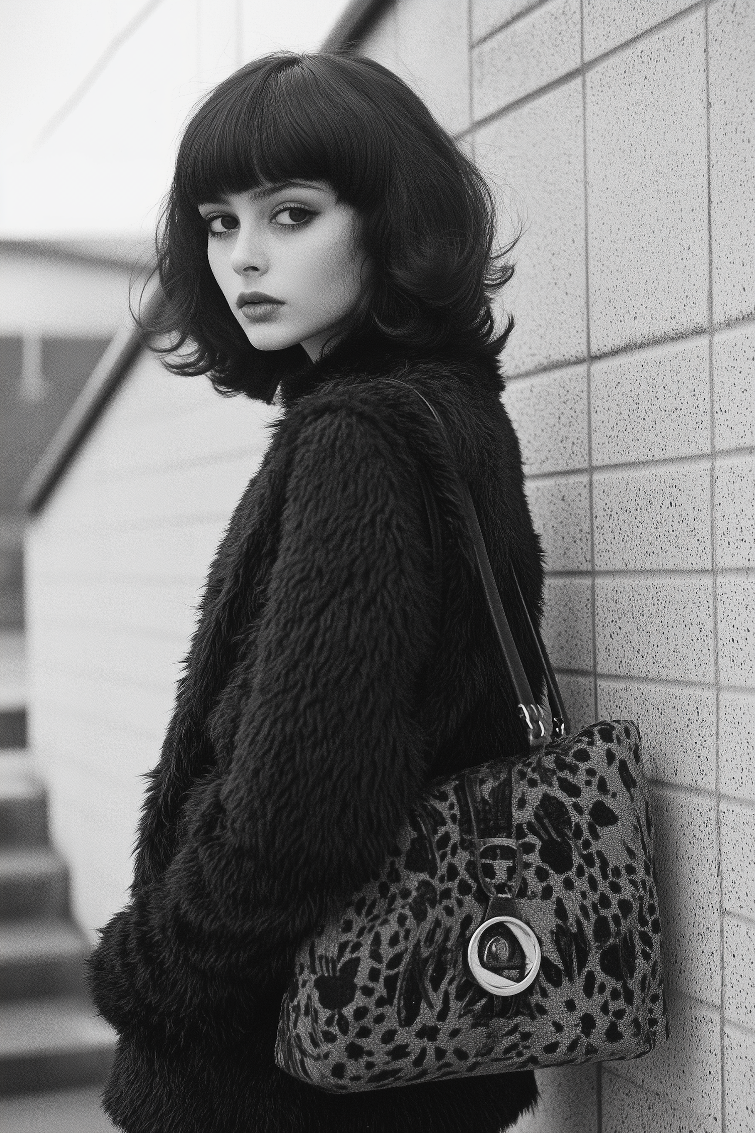 Black-and-white portrait of a stylish woman with a fur coat and patterned handbag, exuding vintage elegance.