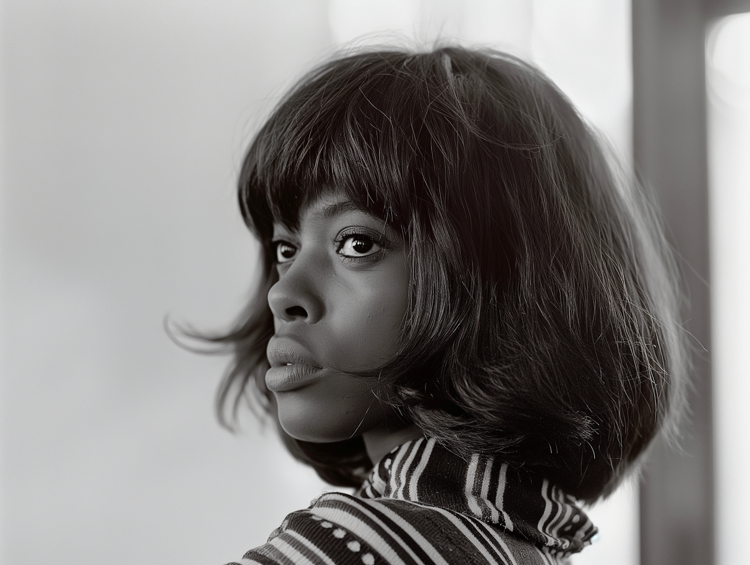 Black and white portrait of a young woman with a bob haircut, wearing a striped turtleneck, gazing over her shoulder.