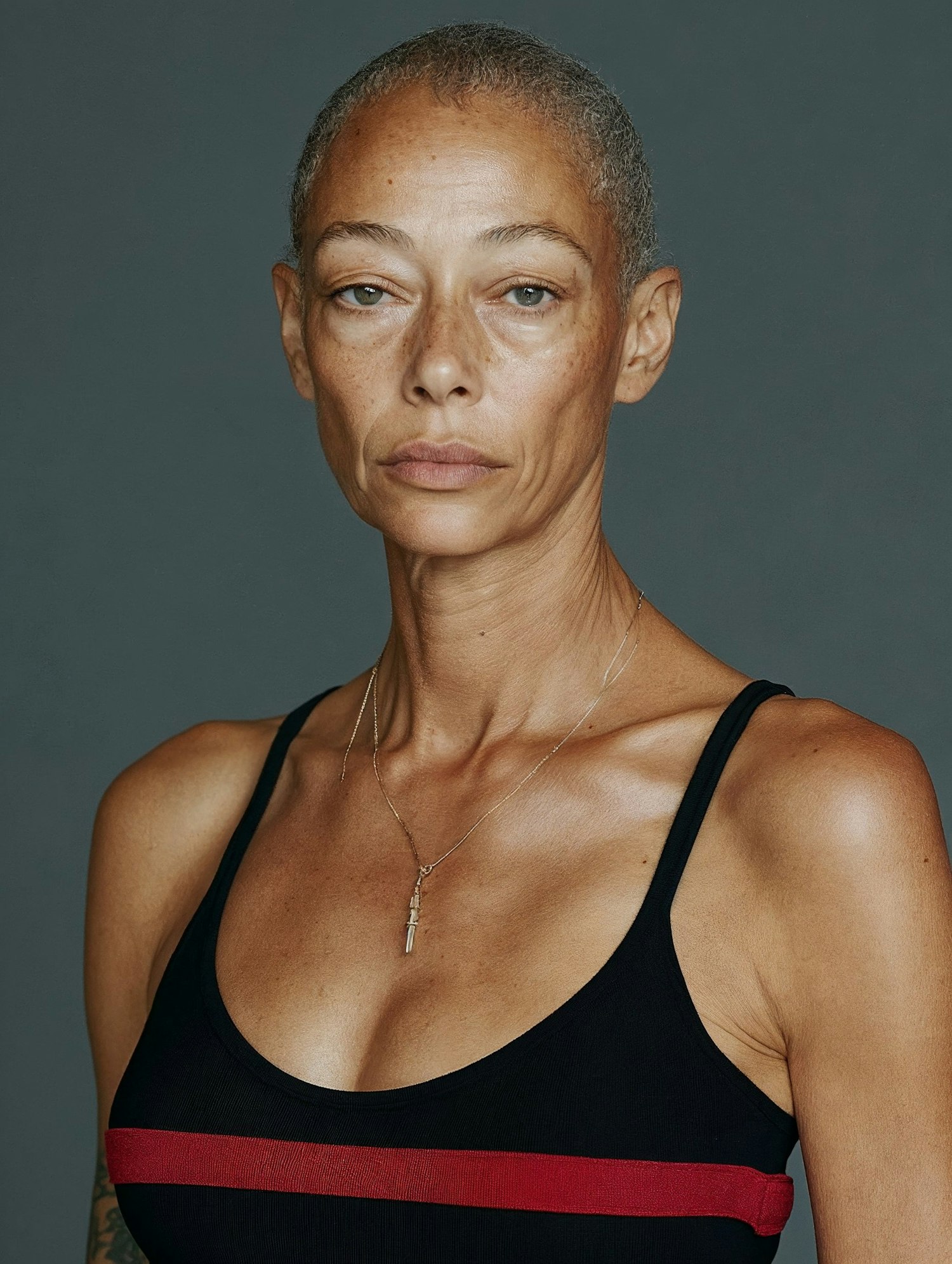 Portrait of a woman with short gray hair, light green eyes, and freckles, wearing a black tank top with a red stripe and a gold necklace.