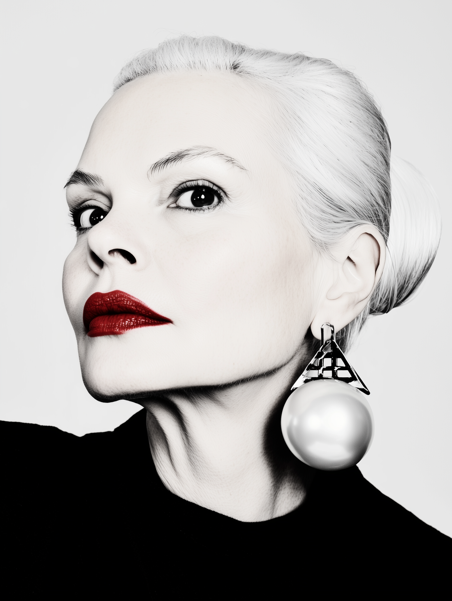 Close-up of a woman with platinum blonde hair, bold red lips, and a dramatic pearl earring against a minimal background.