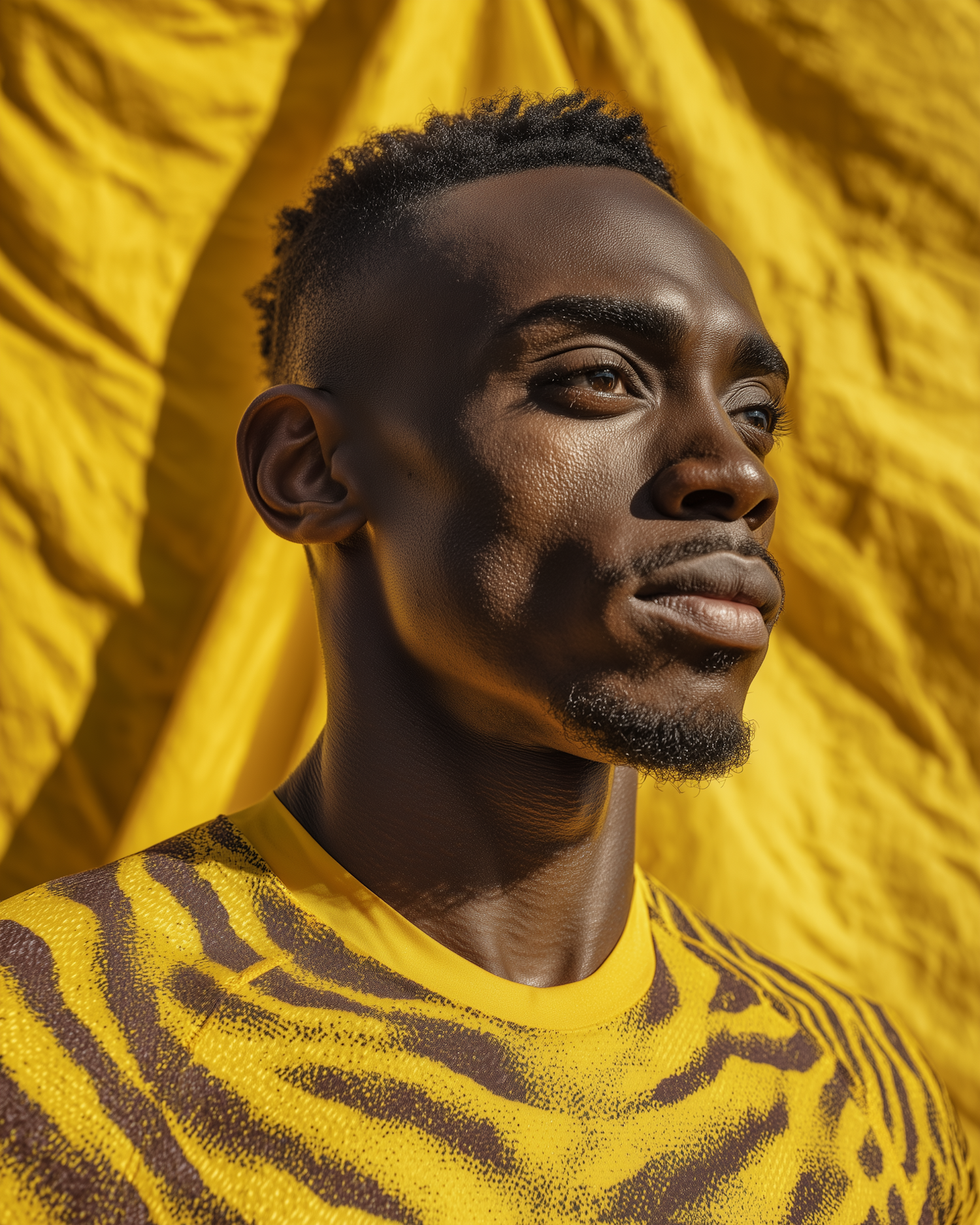 Close-up of a man in a yellow tiger-stripe shirt against a yellow backdrop, with striking lighting emphasizing his features.