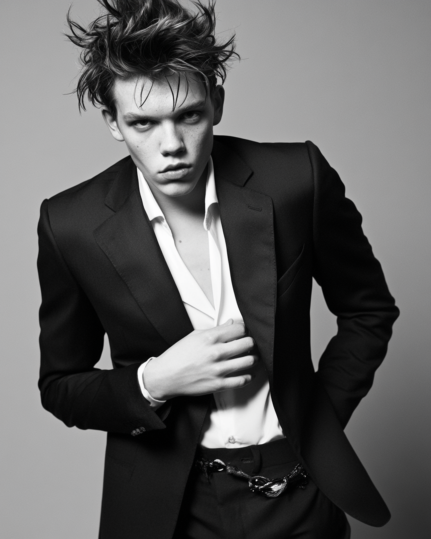 Young man in a black suit with tousled hair and intense gaze in a monochrome portrait, exuding a rebellious and stylish vibe.
