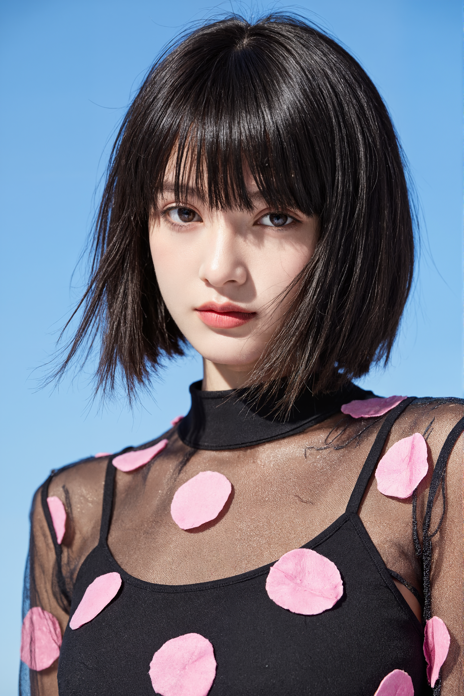 Asian woman with bob haircut in a sheer black top with pink polka dots against a clear blue sky, exuding confidence and style.