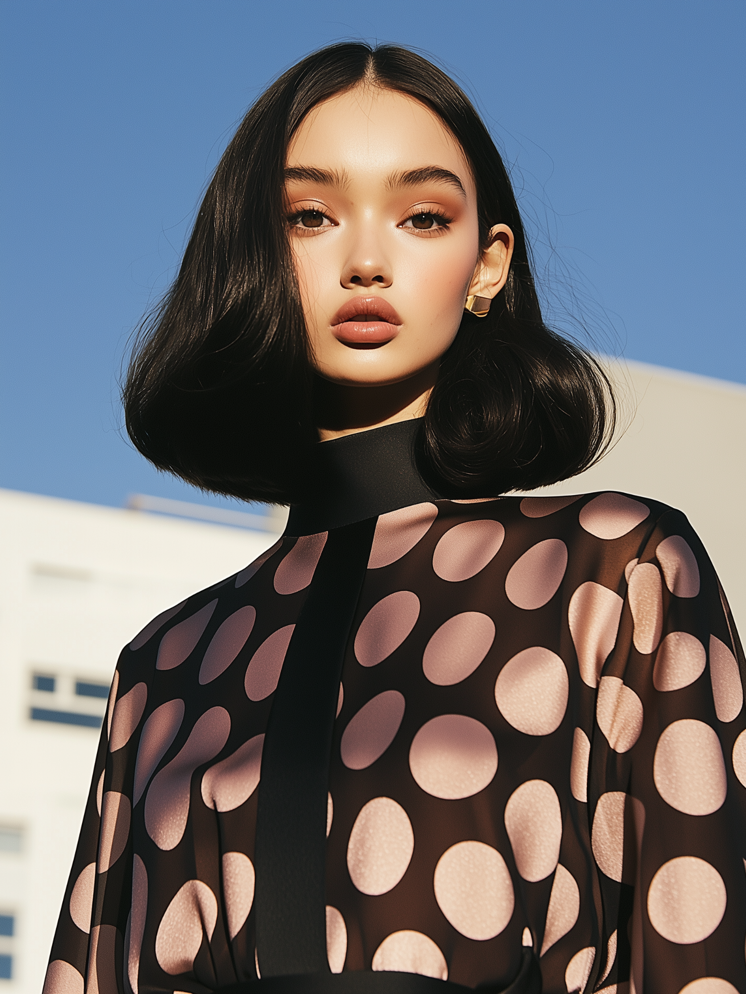 Stylish Asian woman in a polka dot top against a clear blue sky, exuding confidence and elegance.