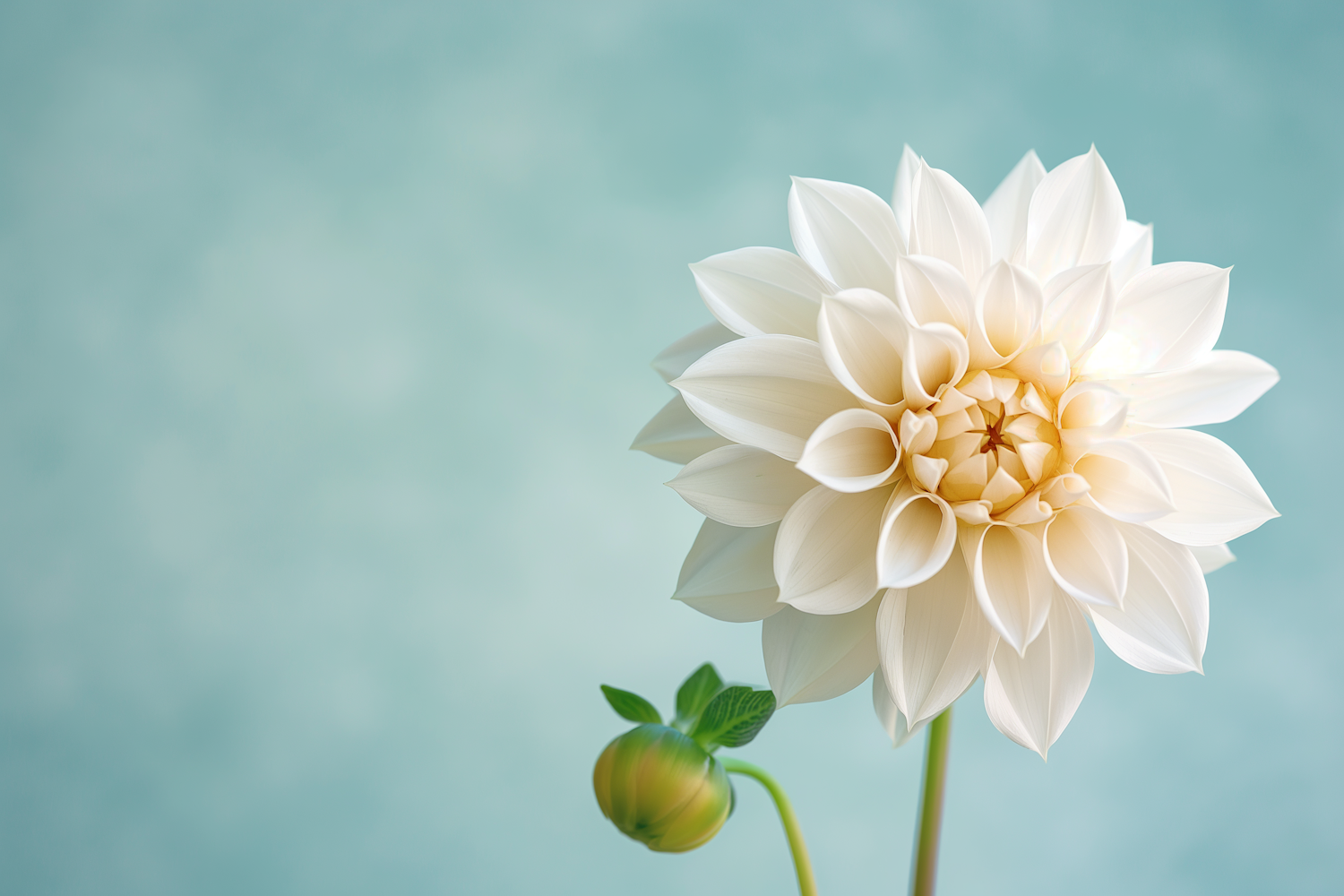Elegant white dahlia against a soft turquoise background, showcasing intricate petal patterns and a budding green stem.