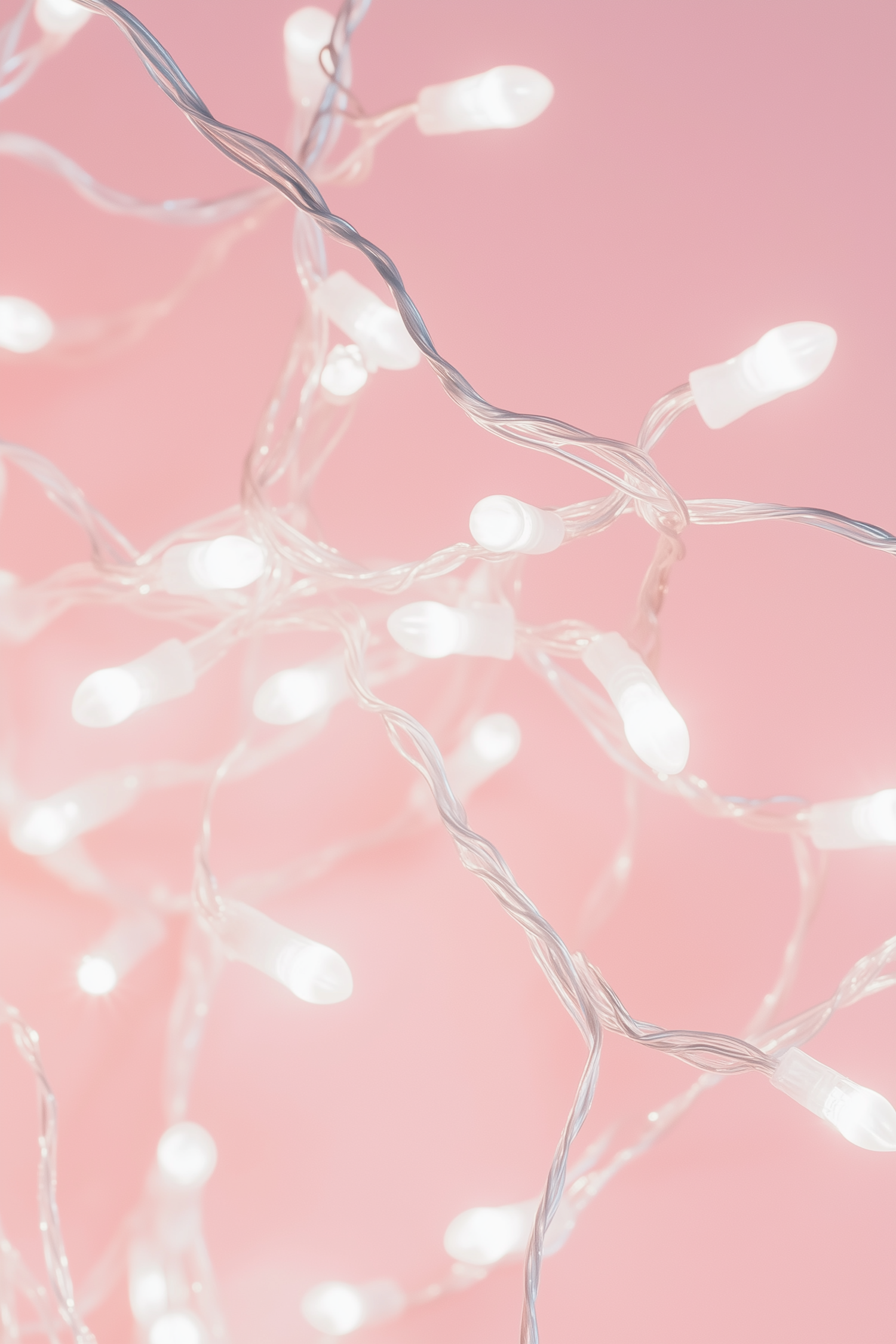 Tangled white LED string lights glowing against a pastel pink background, creating a festive and cozy ambiance.