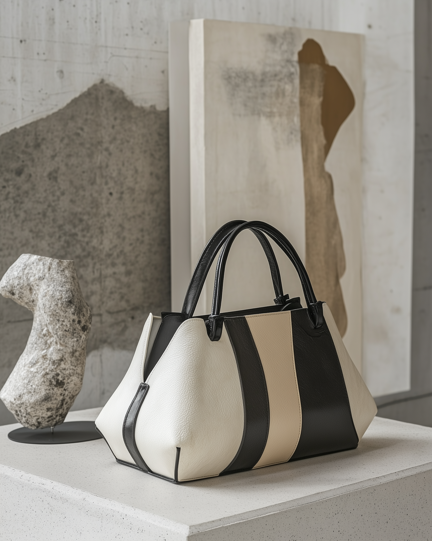 Chic black and cream striped handbag on a minimalist surface, paired with abstract art and sculpture for a modern aesthetic.