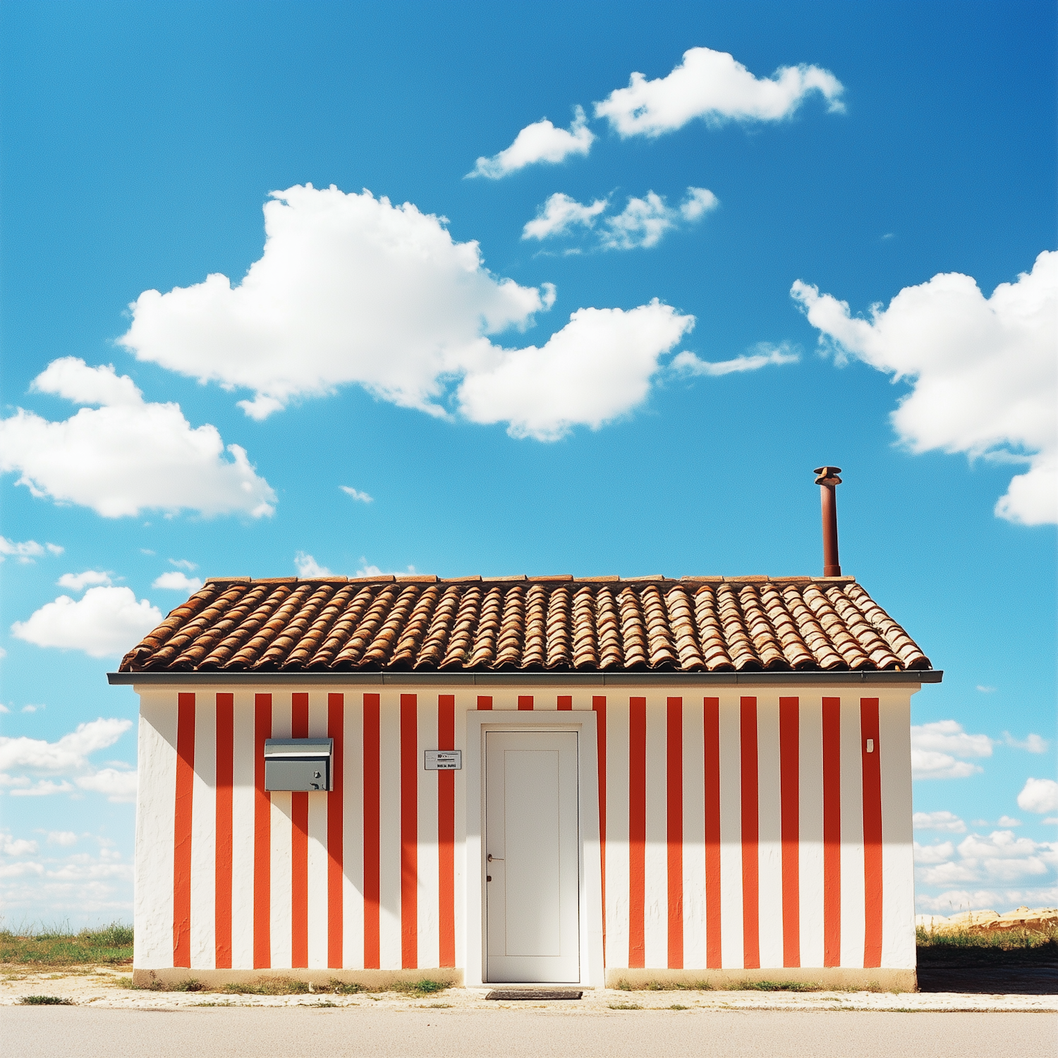 Charming small house with red and white striped walls, terracotta roof, and a bright blue sky with fluffy clouds in the background.