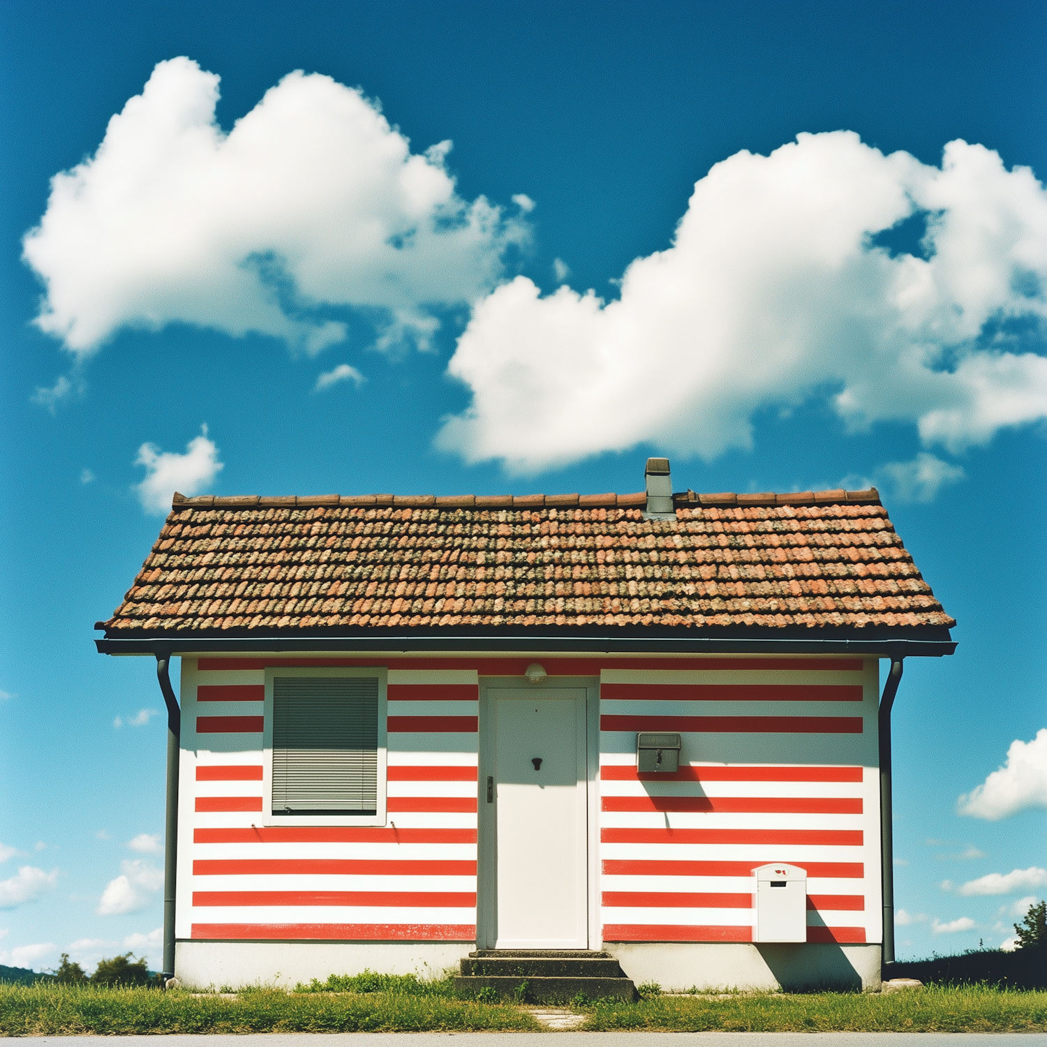 Charming small house with red and white stripes, tiled roof, and a bright blue sky with fluffy clouds. Perfect for quirky architecture lovers.