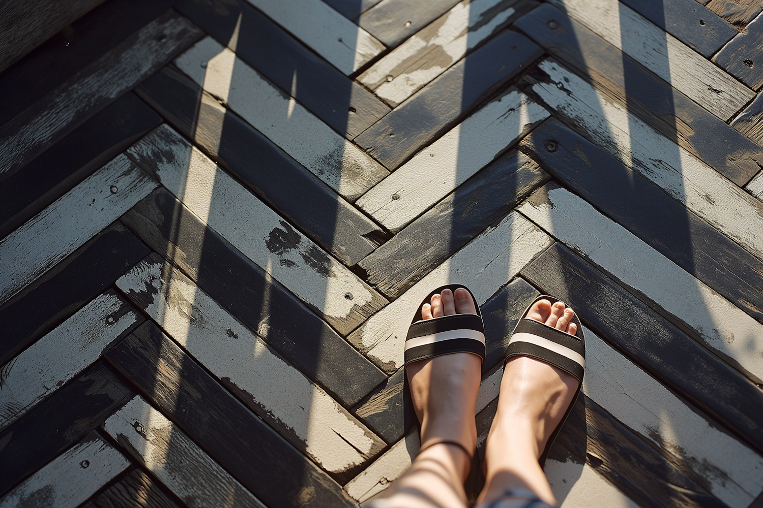Feet in striped sandals on a rustic black-and-white herringbone wooden floor with dramatic shadows and warm lighting.