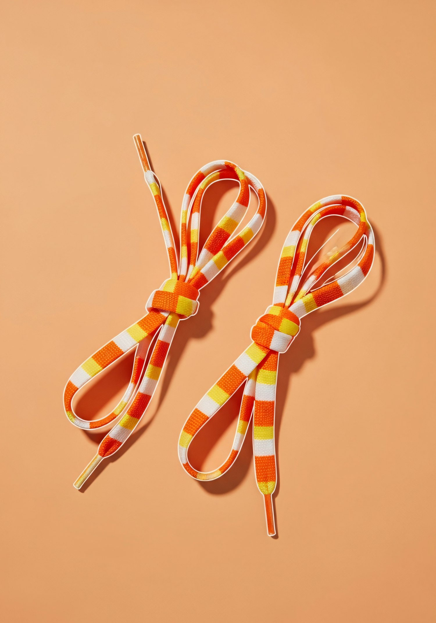 Brightly colored striped shoelaces tied in loops on an orange background, showcasing their vibrant orange, yellow, and white pattern.