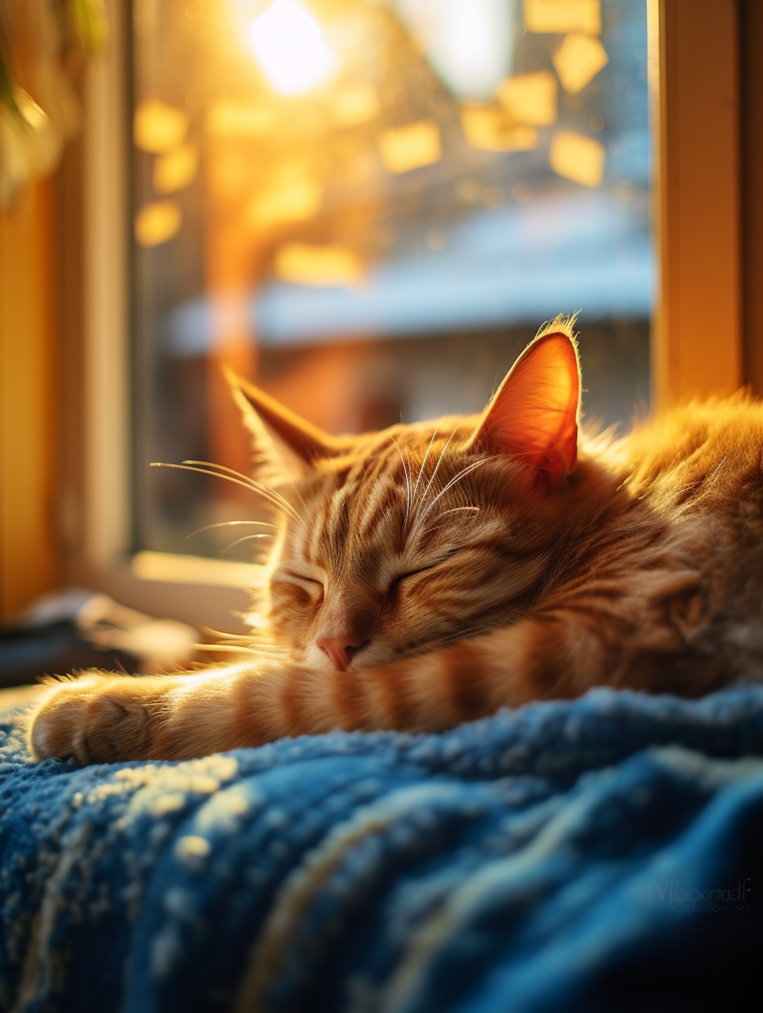 Ginger tabby cat sleeping on a blue blanket, bathed in warm sunlight from a nearby window, creating a cozy and serene atmosphere.