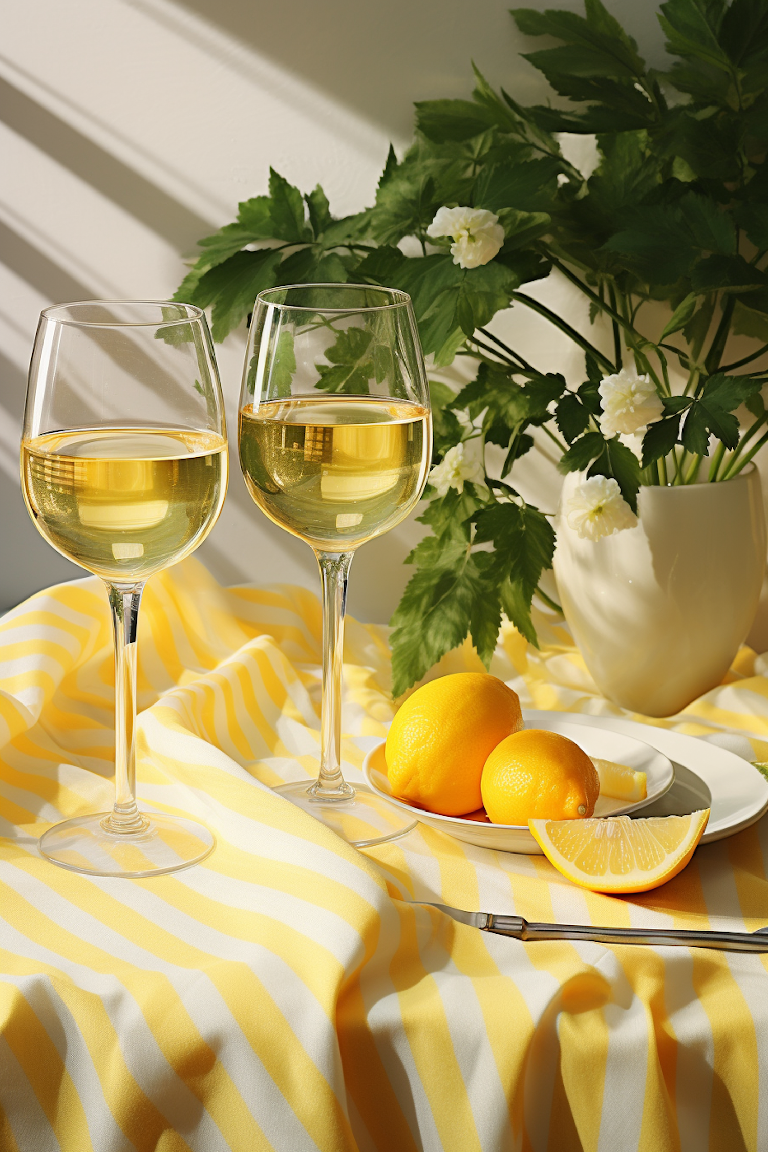 Two wine glasses with white wine, lemons, and a vase with flowers on a striped cloth, bathed in sunlight.