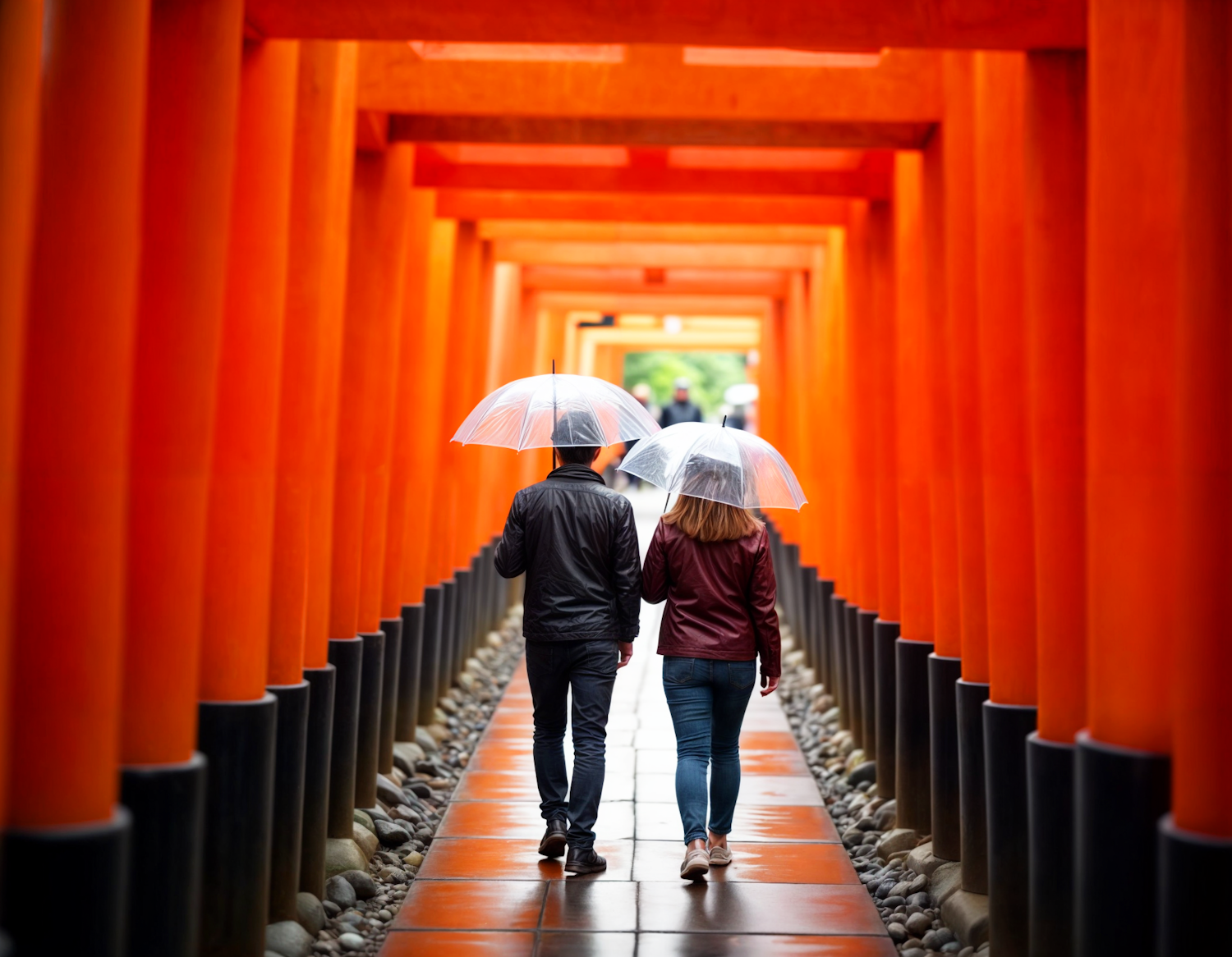Couple walking under vibrant orange torii gates with transparent umbrellas on a rainy day, creating a serene and intimate atmosphere.